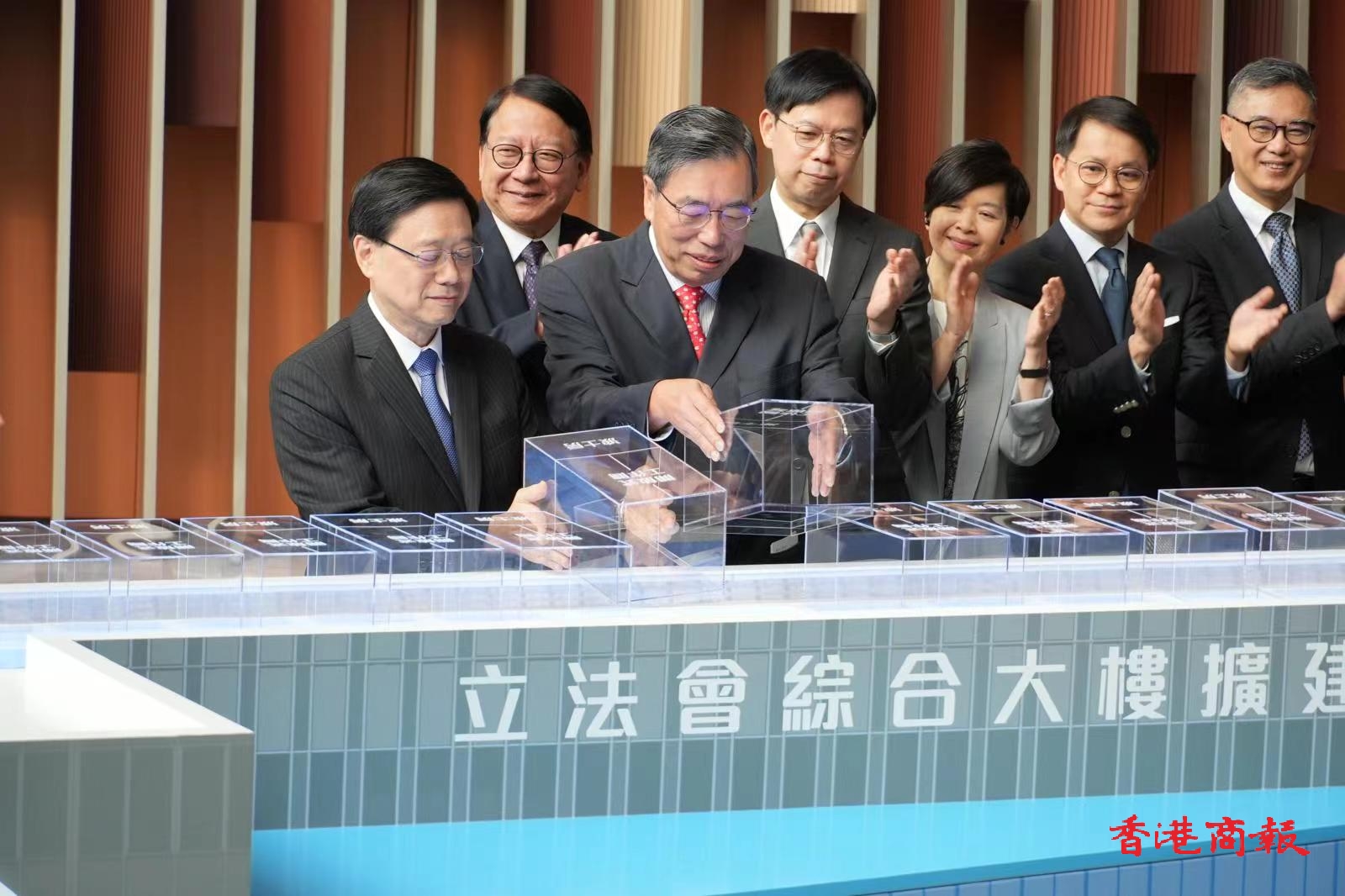 立法會綜合大樓新建的議員樓層今日(23日)順利平頂。行政長官李家超、政務(wù)司司長陳國基、政府跨部門團隊、立法會主席梁君彥及一眾立法會議員一同出席平頂儀式,見證擴建工程邁進新里程。