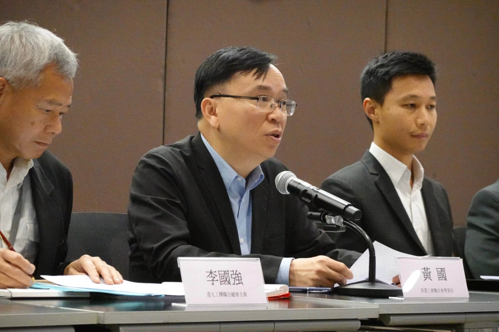 工聯(lián)會(huì)理事長(zhǎng)黃國(guó)(中)、勞聯(lián)主席林振昇(右)等人出席記者會(huì)。林駿強(qiáng)攝