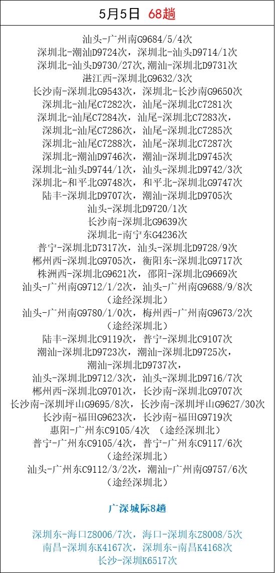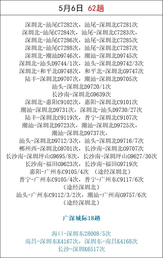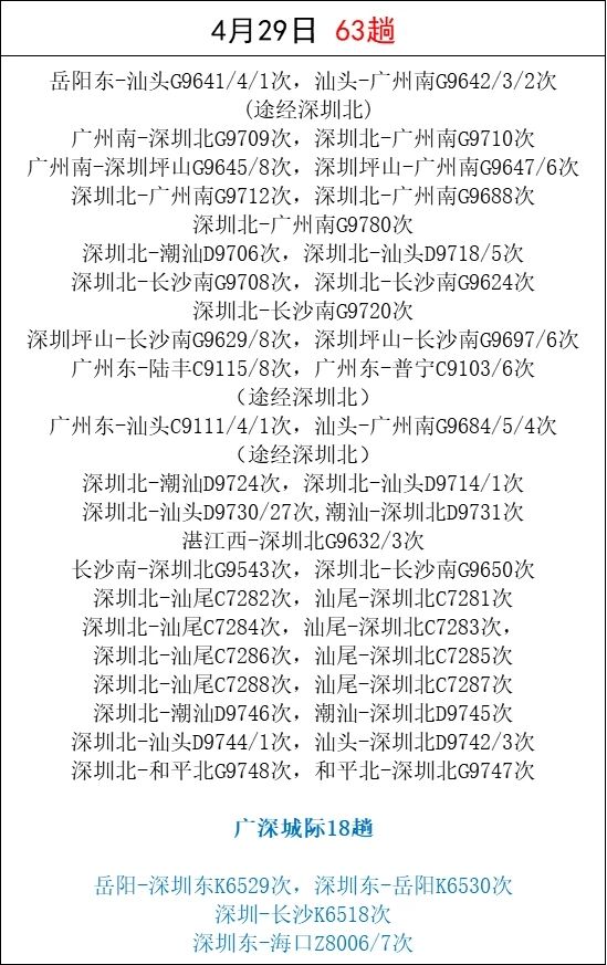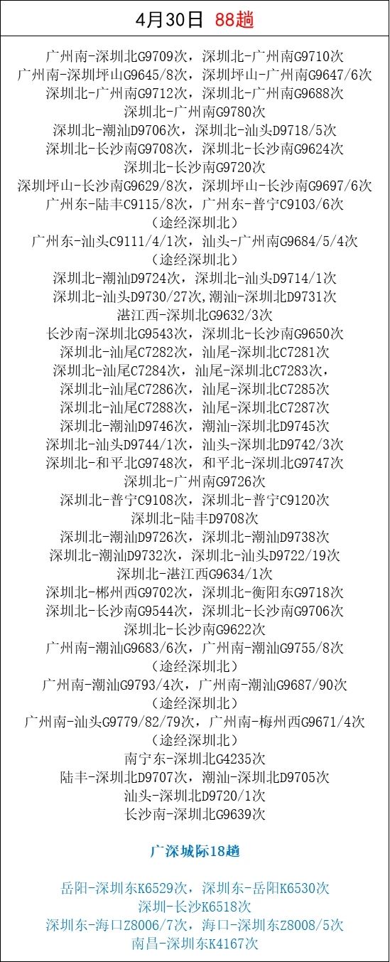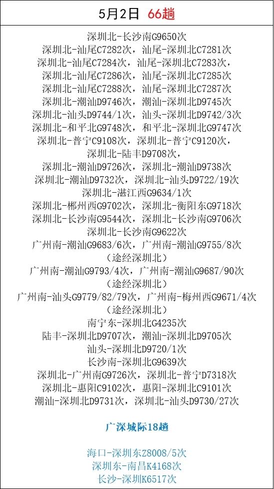 「五一」假期即將來(lái)臨,為滿(mǎn)足市民和旅客朋友的出行需求,深圳鐵路根據(jù)鐵路12306候補(bǔ)數(shù)據(jù)和客流特徵,適時(shí)加開(kāi)廣州、汕尾、潮汕、長(zhǎng)沙等熱門(mén)方向的旅客列車(chē)。深圳東站還加開(kāi)了往返??诘闹边_(dá)列車(chē)。截至23日16時(shí),加開(kāi)旅客列車(chē)494趟。