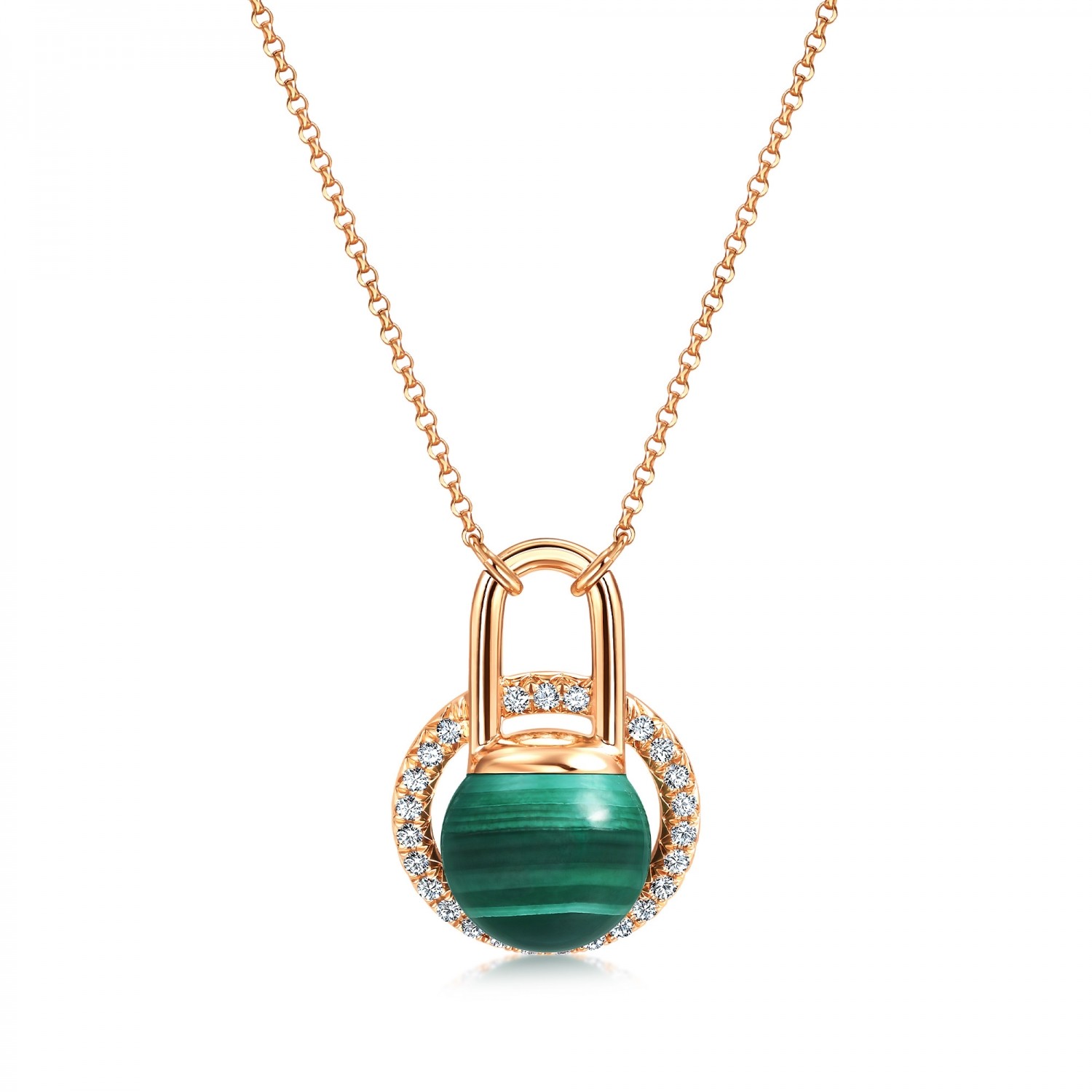 孔雀石吊墜頸鏈採用18K玫瑰金鎖頭連結(jié),孔雀石的光澤和美鑽互相輝映。