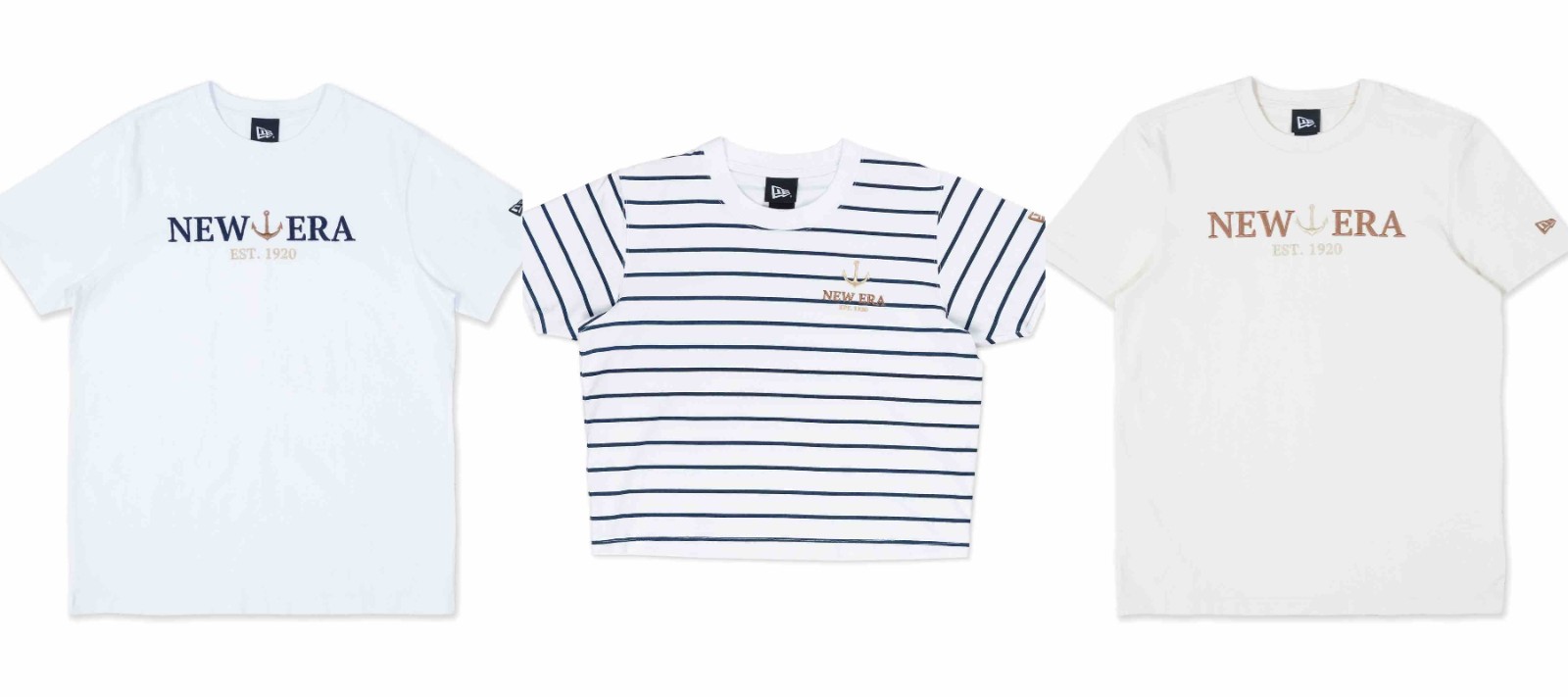 SAILOR CLUB系列備有三款以黑色、白色和奶白色為底色的 T 恤,胸前點綴船錨圖案和 NEW ERA 字樣,以及一款水手風(fēng)格配色條紋T恤,更顯清涼感。