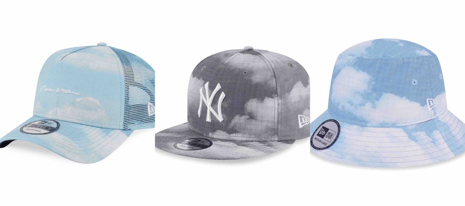 CLOUD 系列提供 9FIFTY、9FORTY 和 BUCKET 01,帽身設(shè)計以數(shù)碼雲(yún)彩印花圖紋為主,帽子前方印有紐約洋基隊或洛杉磯道奇隊隊標(biāo)。