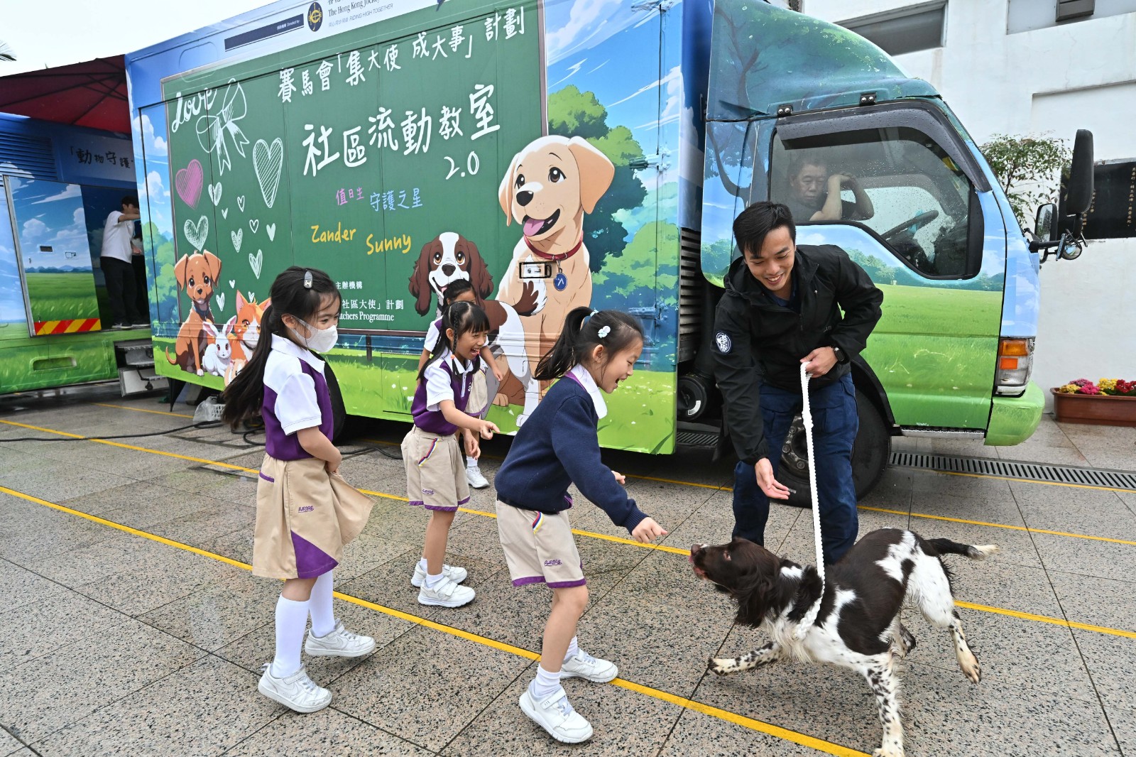 警方今日連同計(jì)劃宣傳車「社區(qū)流動(dòng)教室2.0」於八鄉(xiāng)中心小學(xué)向超過(guò)200名學(xué)生宣傳愛(ài)護(hù)動(dòng)物的信息,並派發(fā)紀(jì)念品。4隻「守護(hù)之星」警犬亦親身與學(xué)生互動(dòng)及拍照?!干鐓^(qū)流動(dòng)教室2.0」將於本周六和日到訪中環(huán)碼頭摩天輪和西貢萬(wàn)年街(海鮮街牌坊),並於下星期到訪更多學(xué)校及公眾地方。(記者 區(qū)天海)