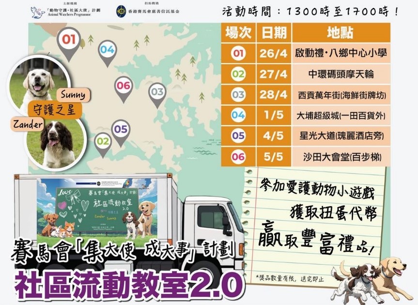 警務(wù)處推出「動(dòng)物守護(hù)·社區(qū)大使」計(jì)劃於2021年舉辦「社區(qū)流動(dòng)教室」宣傳車活動(dòng),走訪全港20個(gè)地點(diǎn),吸引近5000名市民參與。今年,香港賽馬會(huì)慈善信託基金捐助警務(wù)處推展的「賽馬會(huì)『集大使 成大事』計(jì)劃」將推出升級(jí)版「社區(qū)流動(dòng)教室2.0」,由4月26日至5月10日走訪全港不同學(xué)校及寵物友善的公眾地方,透過(guò)有趣的電子遊戲,教育學(xué)生大眾協(xié)助舉報(bào)與動(dòng)物有關(guān)的案件、照顧寵物的生活細(xì)節(jié)及介紹計(jì)劃的背景。