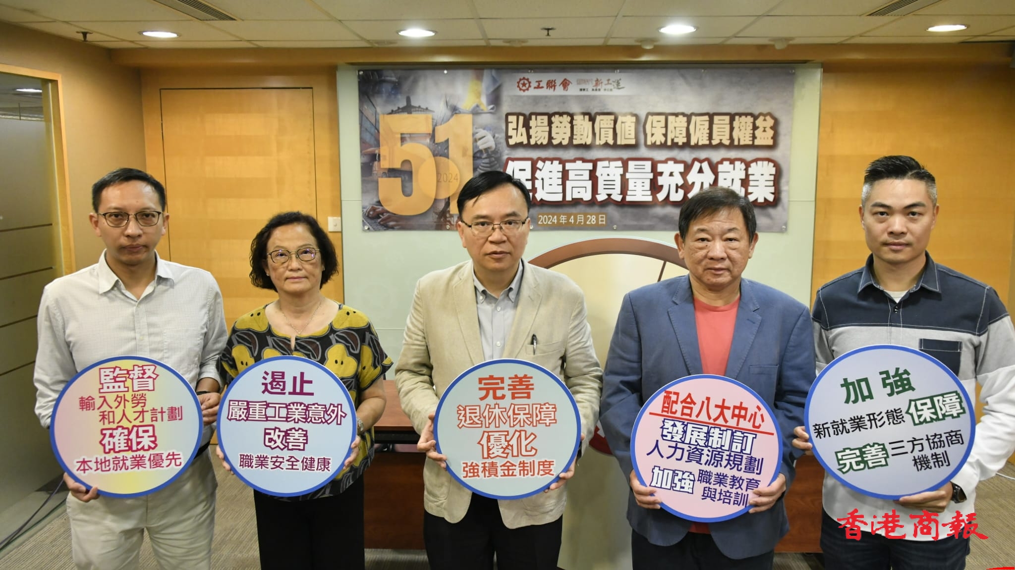 工聯(lián)會今日(28日)發(fā)表工聯(lián)會五一勞動節(jié)政策倡議。工聯(lián)會理事長黃國介紹五項倡議為「配合八大中心發(fā)展制訂人力資源規(guī)劃,加強職業(yè)教育與培訓(xùn)」、「監(jiān)督輸入外勞和人才計劃,確保本地就業(yè)優(yōu)先」、「加強新就業(yè)形態(tài)保障,完善三方協(xié)商機制」、「遏止嚴重工業(yè)意外,改善職業(yè)安全健康」、「完善退休保障,優(yōu)化強積金制度」。他解釋有關(guān)倡議是工聯(lián)會進行深入調(diào)查研究、諮詢各行業(yè)各工友意見所凝聚的共識。