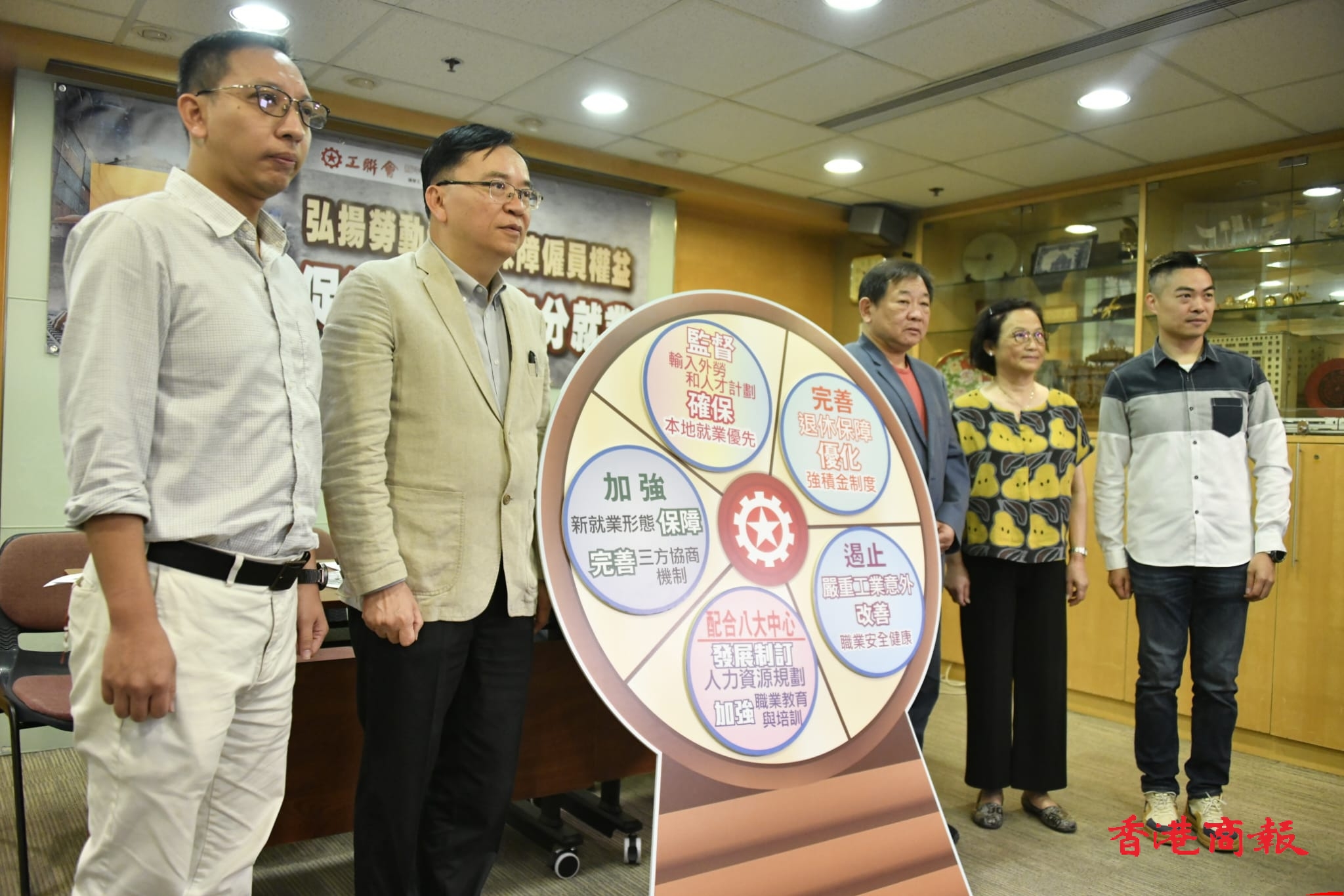 頂圖圖説:工聯(lián)會權(quán)益委員會副主任、勞顧會僱員代表林偉江,工聯(lián)會榮譽會長、職安健協(xié)會主席林淑儀,工聯(lián)會理事長黃國,工聯(lián)會職訓(xùn)就業(yè)委主任陳鄧源和工聯(lián)會權(quán)益委員會主任丘燿誠合照。蔡啟文攝