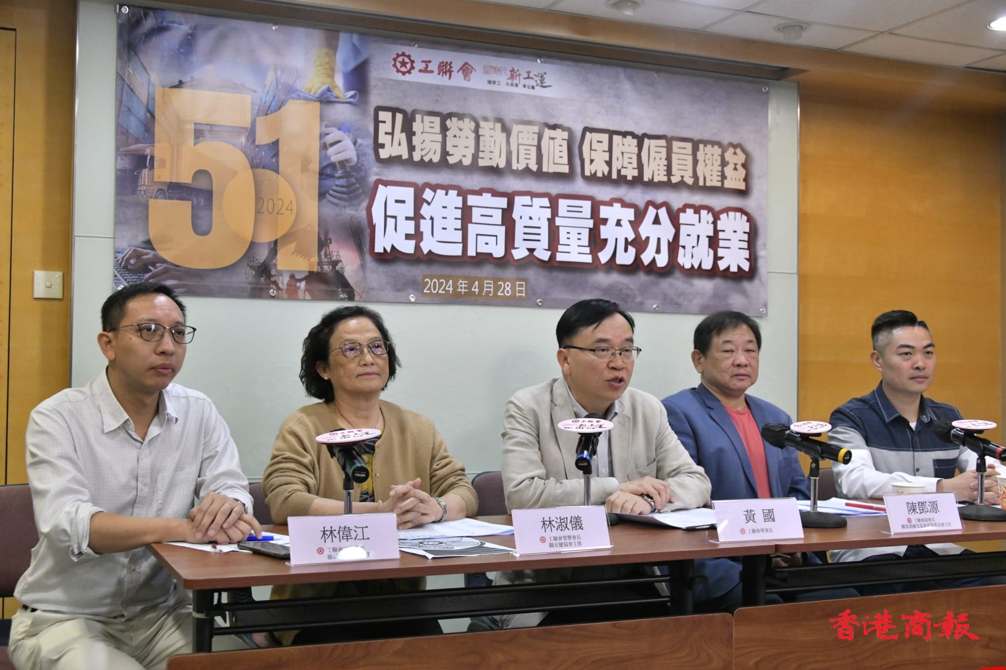 工聯(lián)會權(quán)益委員會副主任、勞顧會僱員代表林偉江,工聯(lián)會榮譽會長、職安健協(xié)會主席林淑儀,工聯(lián)會理事長黃國,工聯(lián)會職訓(xùn)就業(yè)委主任陳鄧源和工聯(lián)會權(quán)益委員會主任丘燿誠出席記者會。蔡啟文攝