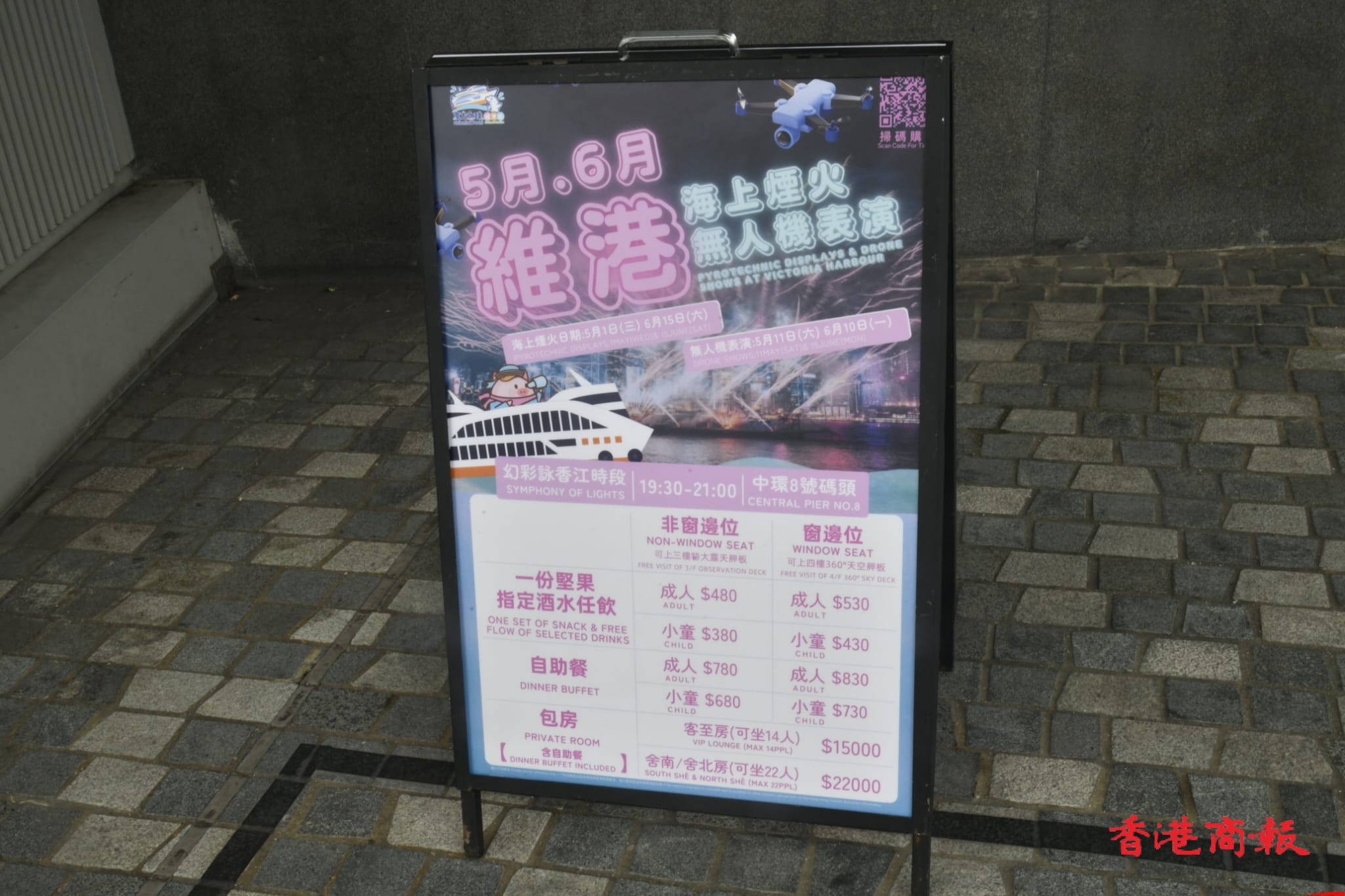 星光大道有遊船河公司以看煙火為主題吸引客戶,但至中午,5月1日看煙火的時(shí)段仍有位置。