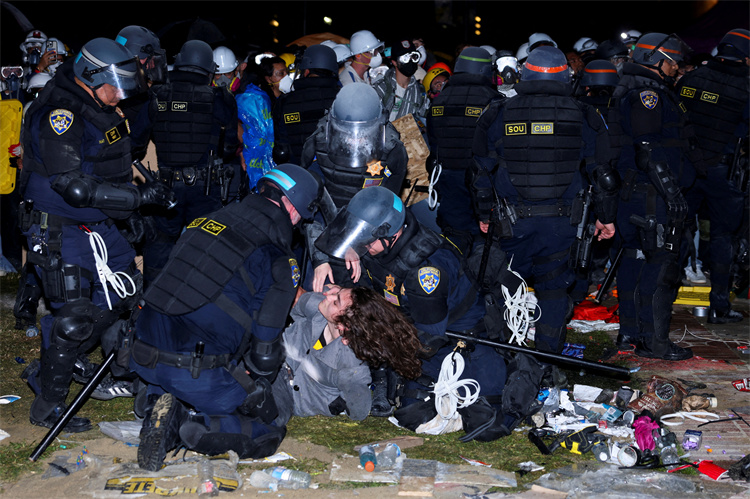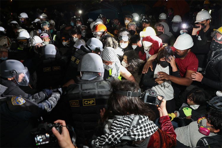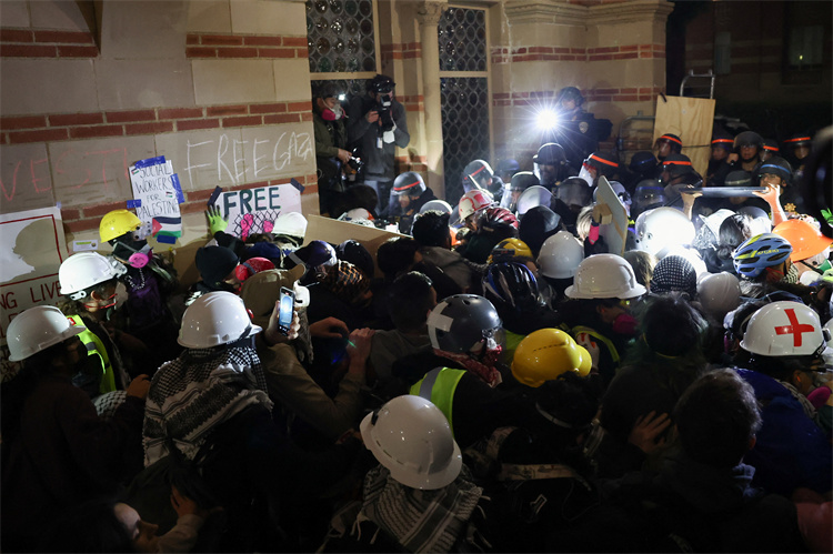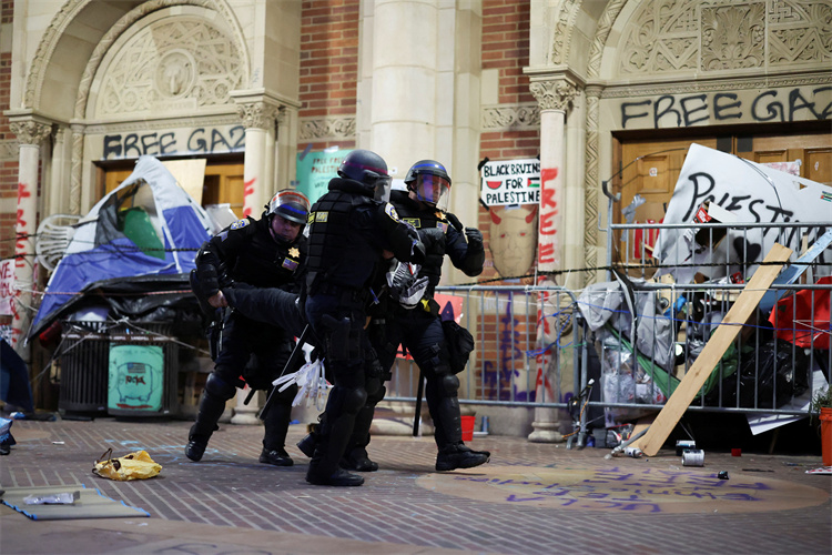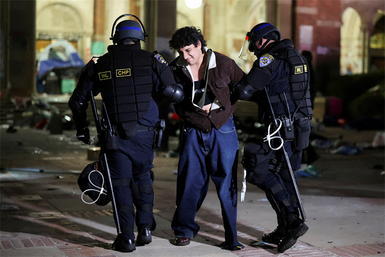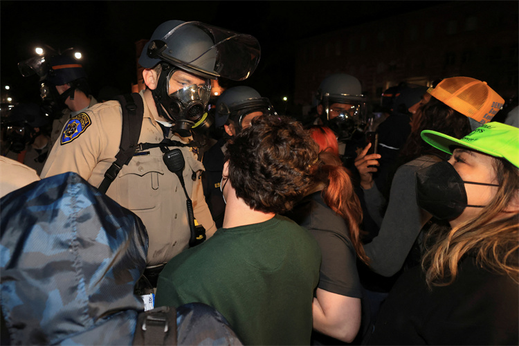 美國多地的大學反戰(zhàn)及支援巴人示威活動持續(xù)。據(jù)美聯(lián)社報道,當?shù)貢r間2日清晨,數(shù)百名戴上防暴裝備的加州公路巡警,在加州大學洛杉磯分校(UCLA)採取清場行動,拆毀示威學生設(shè)置的路障及營地,數(shù)百名示威者不理會警方的撤離令,激烈反抗。截至當?shù)貢r間2日早上,至少有數(shù)十名示威者被捕。