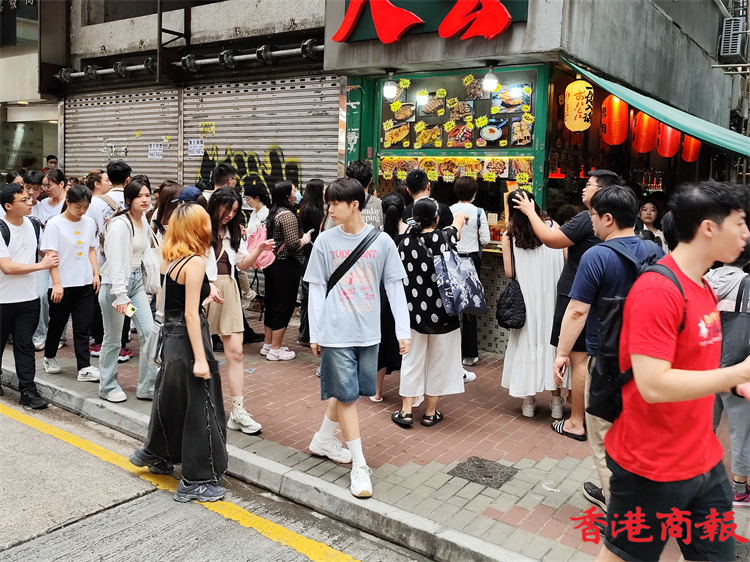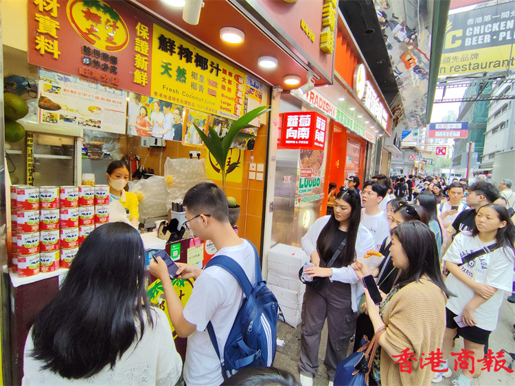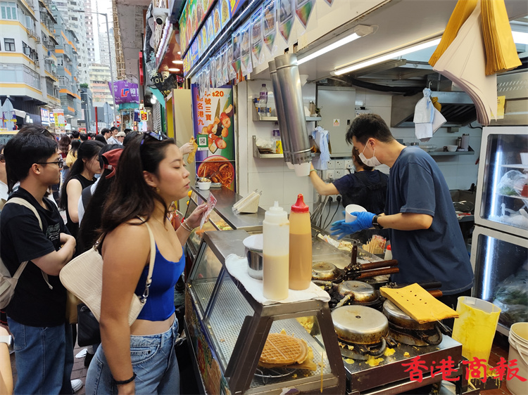 進入五一黃金周第三天,遊客們繼續(xù)「買買買」、「吃吃吃」。其中旺角是香港美食的集中地,當然會吸引遊客慕名而來。雞蛋仔、牛雜、咖喱魚蛋等更是不少遊客趨之若鶩的美食,令到不少售賣小食、特式飲品的小店門庭若市,顧客大排長龍。不少遊客對香港的美食讚不絕口。此外,旺角著名的女人街、波鞋街,以及藥店、金舖等的顧客都是川流不息。(馮瀚文攝)