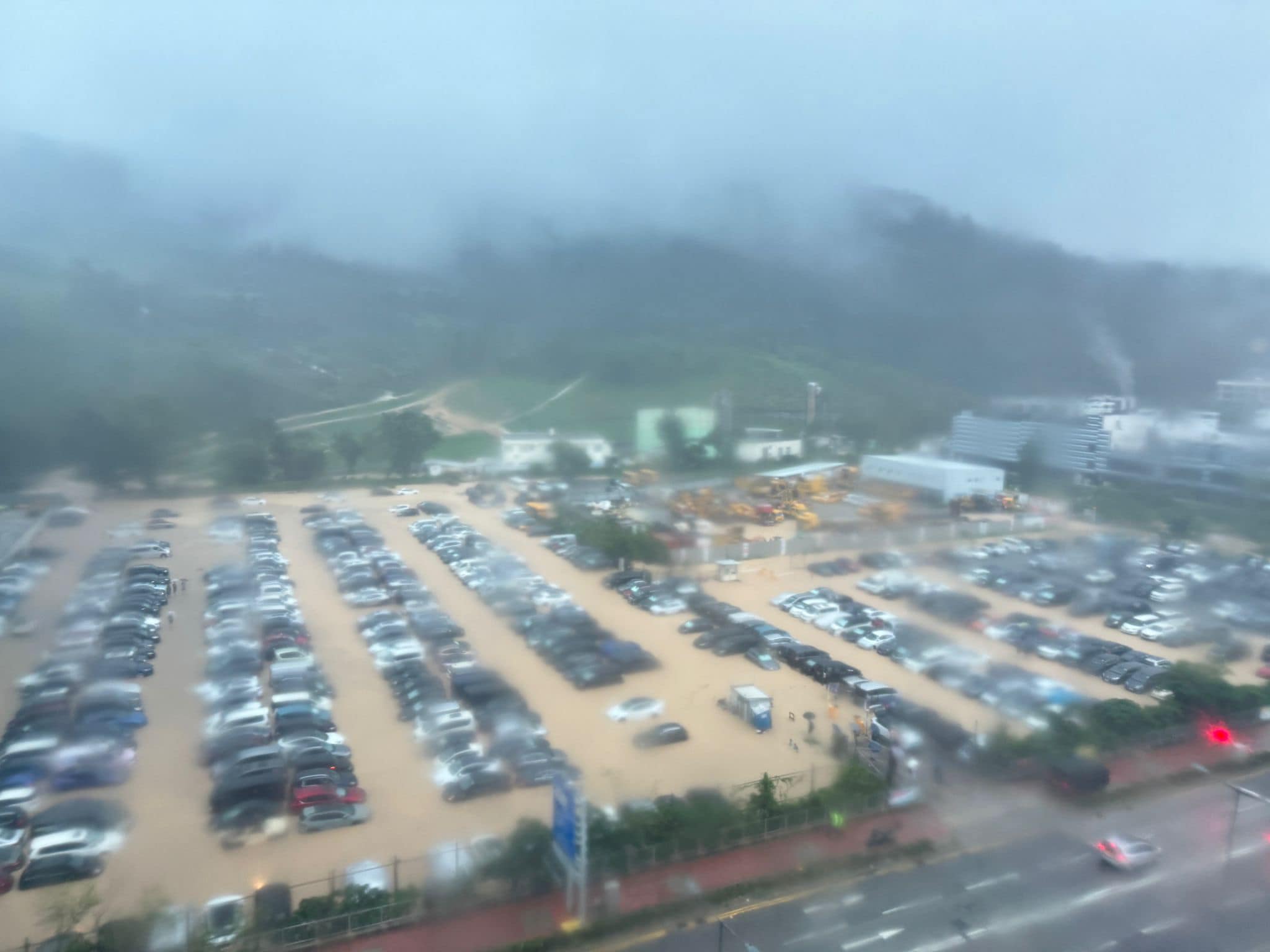 將軍澳環(huán)保大道對開一個(gè)露天停車場,全被黃泥水淹浸,水深達(dá)半架車。(網(wǎng)上圖片)