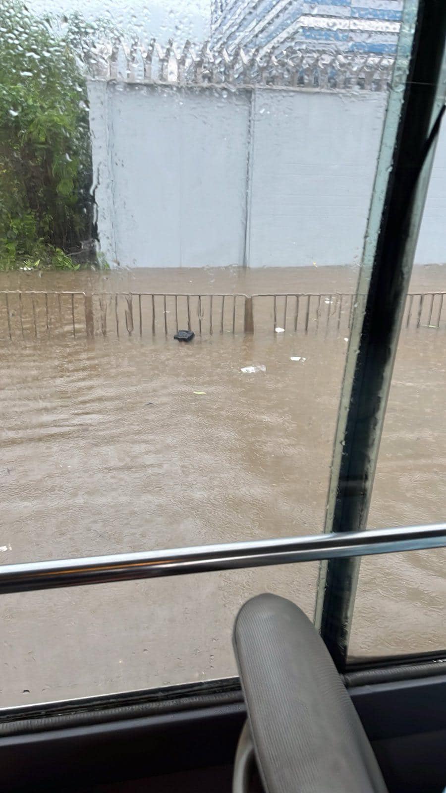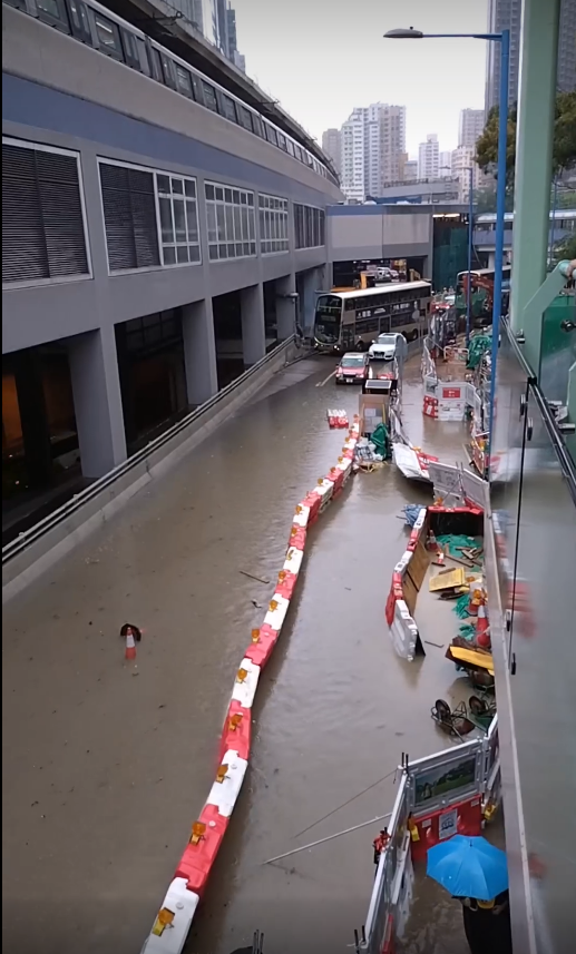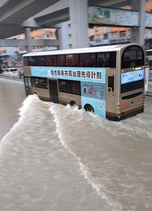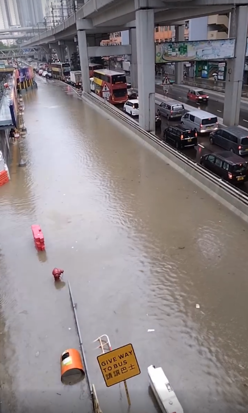 在港鐵觀塘站附近帶的觀塘道,今早在暴雨下同樣出現(xiàn)水浸,水深及膝,不少車輛未能通過,導(dǎo)致交通擠塞,也有雙層巴士涉水而過,有如陸上行舟。