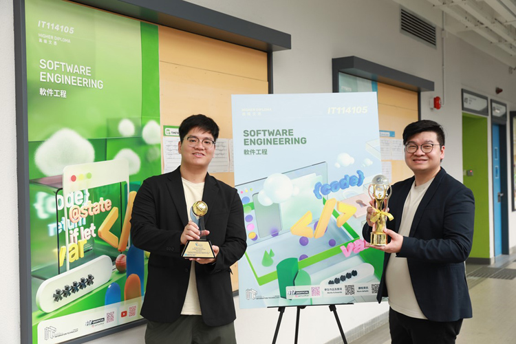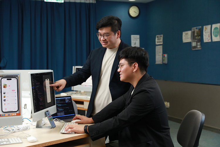 HKIIT高級講師郭譽豪(右)、VTC軟件工程高級文憑畢業(yè)生黃?。ㄗ螅{「Dokodemo Call 隨意通」作品獲得多個中港創(chuàng)科比賽獎項。大會供圖