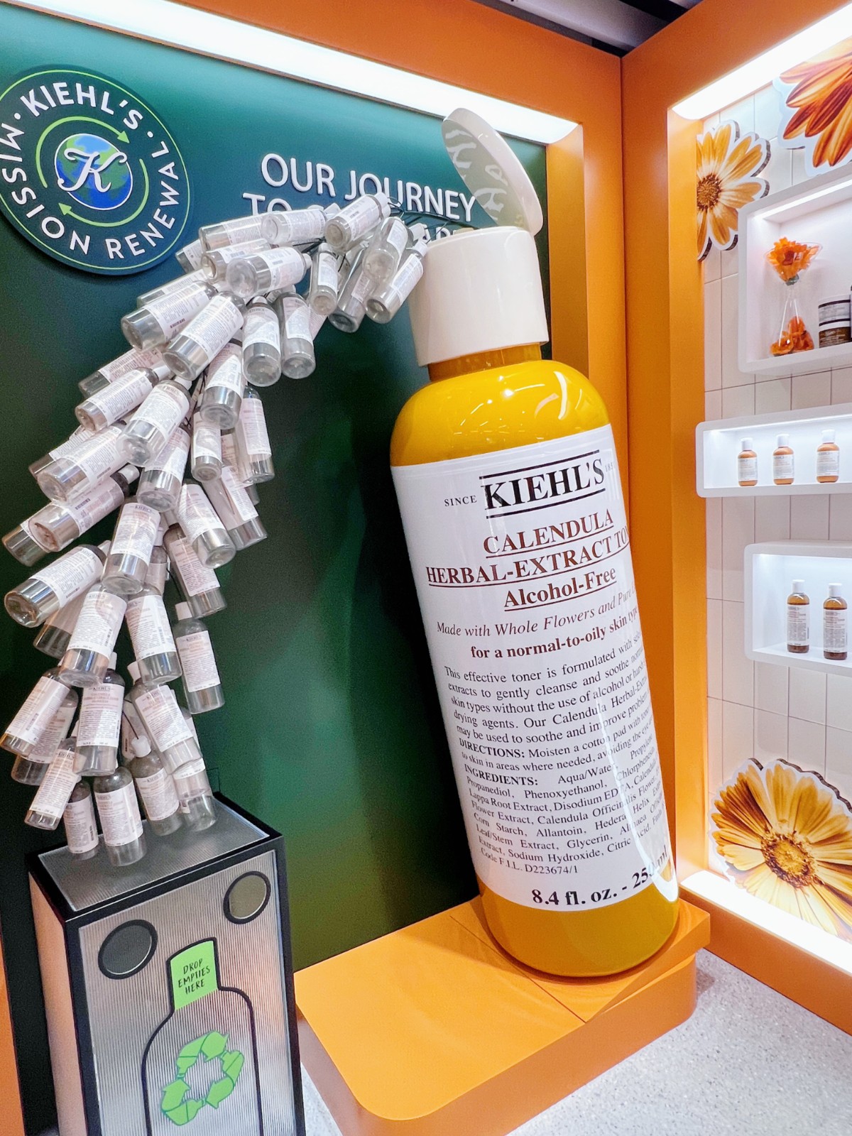店舖並提供個人化服務(wù),在網(wǎng)上登記時預(yù)先回答三條問題,上載一張個人照片到活動網(wǎng)站,再到場購買「金盞花植物精華爽膚水」250ml,可即場把預(yù)先上載的照片打印在爽膚水樽上,製作專屬風(fēng)格的金盞花產(chǎn)品。每個「金盞花植物精華爽膚水」瓶子均是100%回收物料製造,店內(nèi)特設(shè)舊瓶回收箱,鼓勵顧客攜帶已用完的品牌正貨及印有可循環(huán)再用標記的個人面部護理產(chǎn)品膠樽和玻璃樽到場進行回收,品牌會員可以每個空瓶獲得雙倍積分。