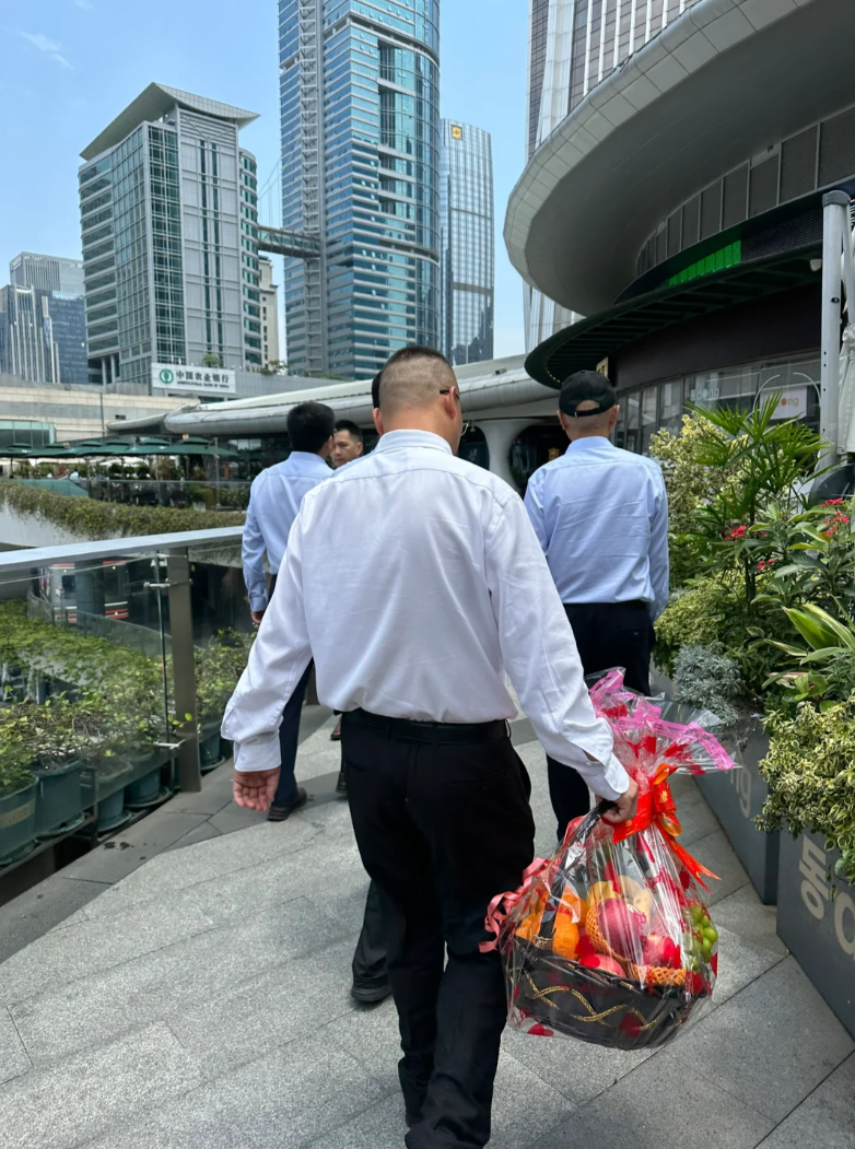 稱自己滿頭大汗在商場提著一個巨大的果籃趕路