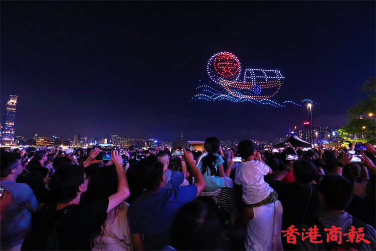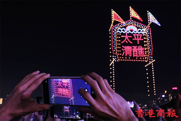 灣仔海濱對(duì)出海面今晚8時(shí)上演旅發(fā)局舉行的首場(chǎng)定期無(wú)人機(jī)表演,長(zhǎng)約10分鐘。為配合下星期來(lái)臨的佛誕及太平清醮,表演以這兩大節(jié)慶為設(shè)計(jì)重點(diǎn),推廣傳統(tǒng)特色,由1000架無(wú)人機(jī)於維港上空約90米,以不同動(dòng)態(tài)陣列展現(xiàn)特色圖案,包括巨大平安包、大包山、太平清醮花牌、醒獅、平安結(jié)等。表演期間,現(xiàn)場(chǎng)將同步播放表演音效。(馮瀚文攝)