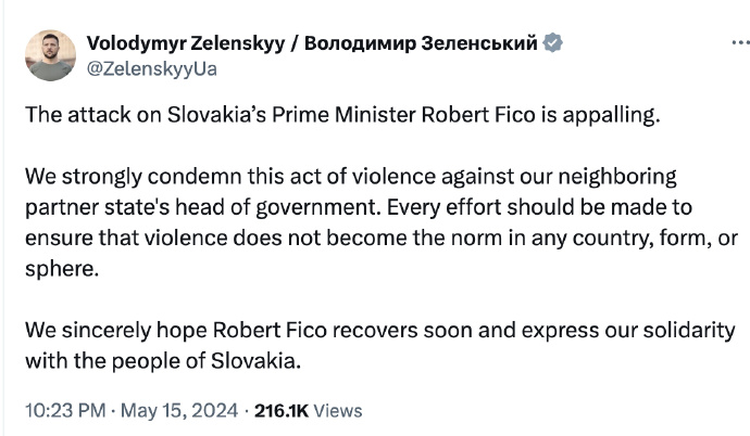 據(jù)外媒最新消息,15日,斯洛伐克總理菲佐在槍擊事件中身中多槍,有生命危險(xiǎn)。剛剛,烏克蘭總統(tǒng)澤連斯基在社交平臺(tái)X發(fā)文:「斯洛伐克總理羅伯特·菲佐被襲令人震驚。我們強(qiáng)烈譴責(zé)這種針對(duì)我們鄰國(guó)夥伴國(guó)家政府首腦的暴力行為,應(yīng)盡一切努力確保暴力不成為任何國(guó)家、任何形式或任何領(lǐng)域的常態(tài)。我們真誠(chéng)地希望羅伯特·菲佐早日康復(fù),並對(duì)斯洛伐克人民表示聲援?!?/p>
