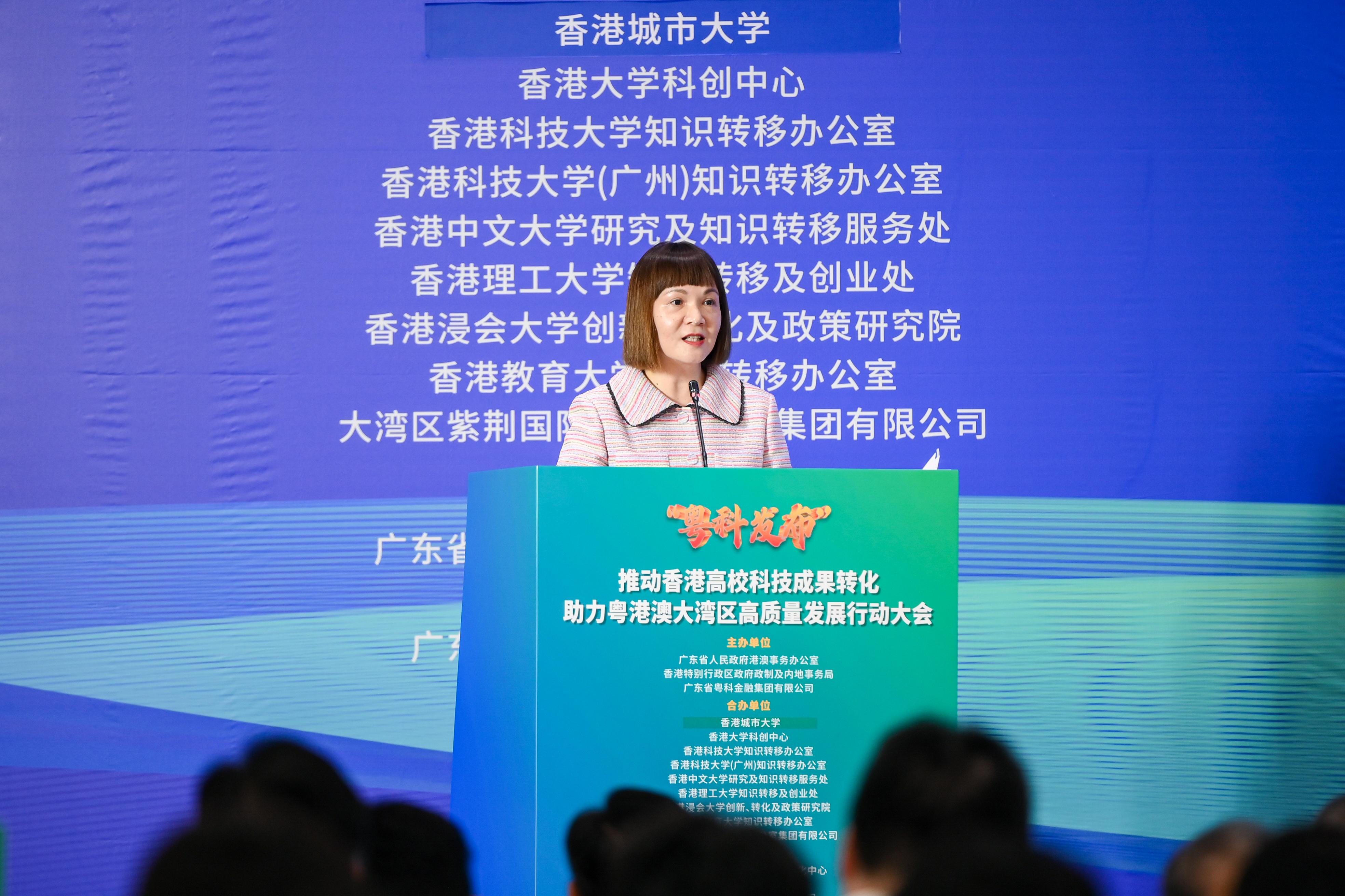 由廣東省人民政府港澳事務(wù)辦公室、政制及內(nèi)地事務(wù)局及廣東省粵科金融集團(tuán)有限公司(粵科金融集團(tuán))共同主辦的「『粵科發(fā)布』推動(dòng)香港高??萍汲晒D(zhuǎn)化 助力粵港澳大灣區(qū)高質(zhì)量發(fā)展行動(dòng)大會(huì)(行動(dòng)大會(huì))」17日在廣州舉行?;浉郯拇鬄硡^(qū)發(fā)展專員陳潔玲到廣州出席行動(dòng)大會(huì)並致辭。