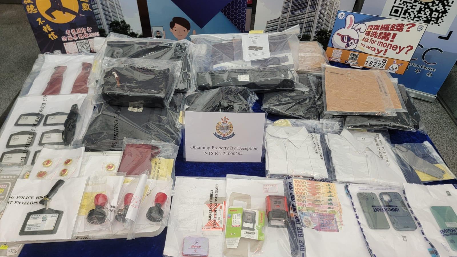 在今日早上,新界南刑事部人員採(cǎi)取行動(dòng),拘捕該名骨幹成員,突擊搜查其住址。行動(dòng)中檢獲被捕人假扮「特務(wù)警察」時(shí)穿著的西裝及領(lǐng)呔,以及曾向受害人出示過(guò)的偽造「香港警察委任證」、公安徽章、公安及香港金管局蓋印、打印機(jī)及過(guò)膠機(jī)等證物。