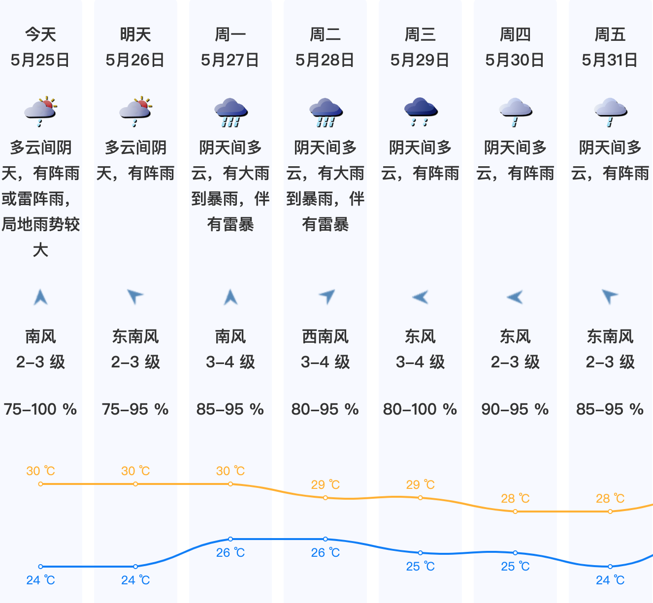 預(yù)計25-26日陰天間多雲(yún),有間歇性陣雨或雷雨,局地雨勢較大,25日氣溫24-29℃;
