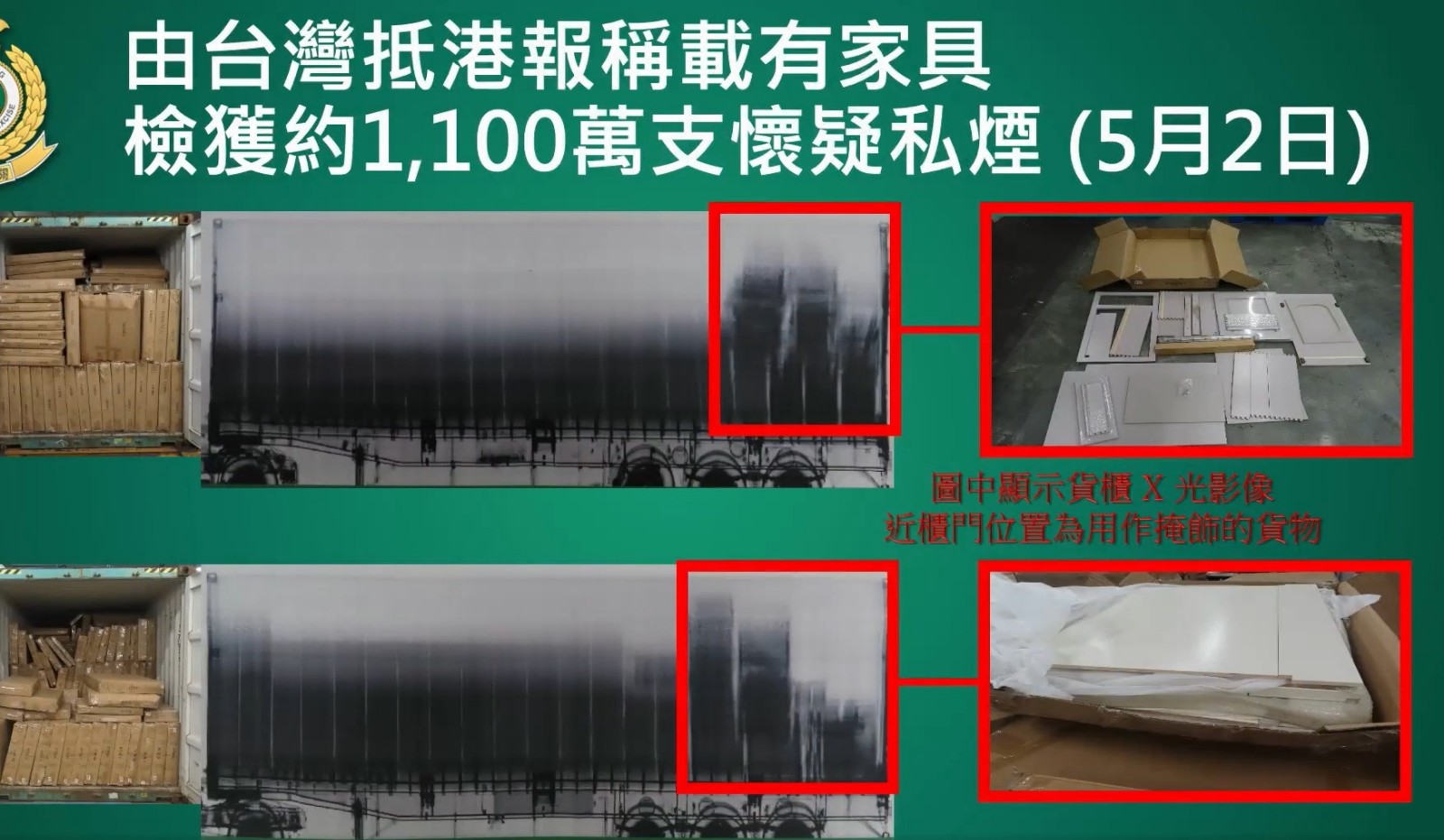 海關(guān)稅收罪案調(diào)查科監(jiān)督劉良智表示,在4月30日透過風險管理和情報分析,在葵涌海關(guān)大樓檢貨場揀選一個由日本抵港、報稱載有化妝品的40呎貨櫃進行檢查,搜出200萬支未完稅香煙,市值約900萬元,應(yīng)課稅值660萬元。至5月初,人員在一個由臺灣抵港、報稱載有家具的貨櫃中,檢獲約1100萬支懷疑私煙,市值約500萬元,應(yīng)課稅值360萬元。