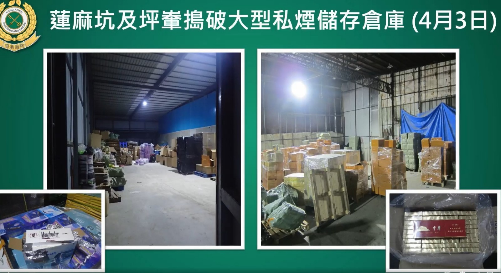 在4月3日,人員於蓮麻坑和坪輋搗破兩個私煙倉庫,檢獲970萬支私煙,市值4600萬元,應(yīng)課稅值3300萬元。在5月22日在蓮麻坑和沙頭角搜查兩個鐵皮倉庫,檢獲4100萬支私煙。另外,調(diào)查發(fā)現(xiàn)私煙集團在市區(qū)內(nèi)以格仔鋪和迷你倉儲存私煙,在5月7日人員在大埔一屋苑兩個單位中,檢獲42萬支私煙,市值190萬元。