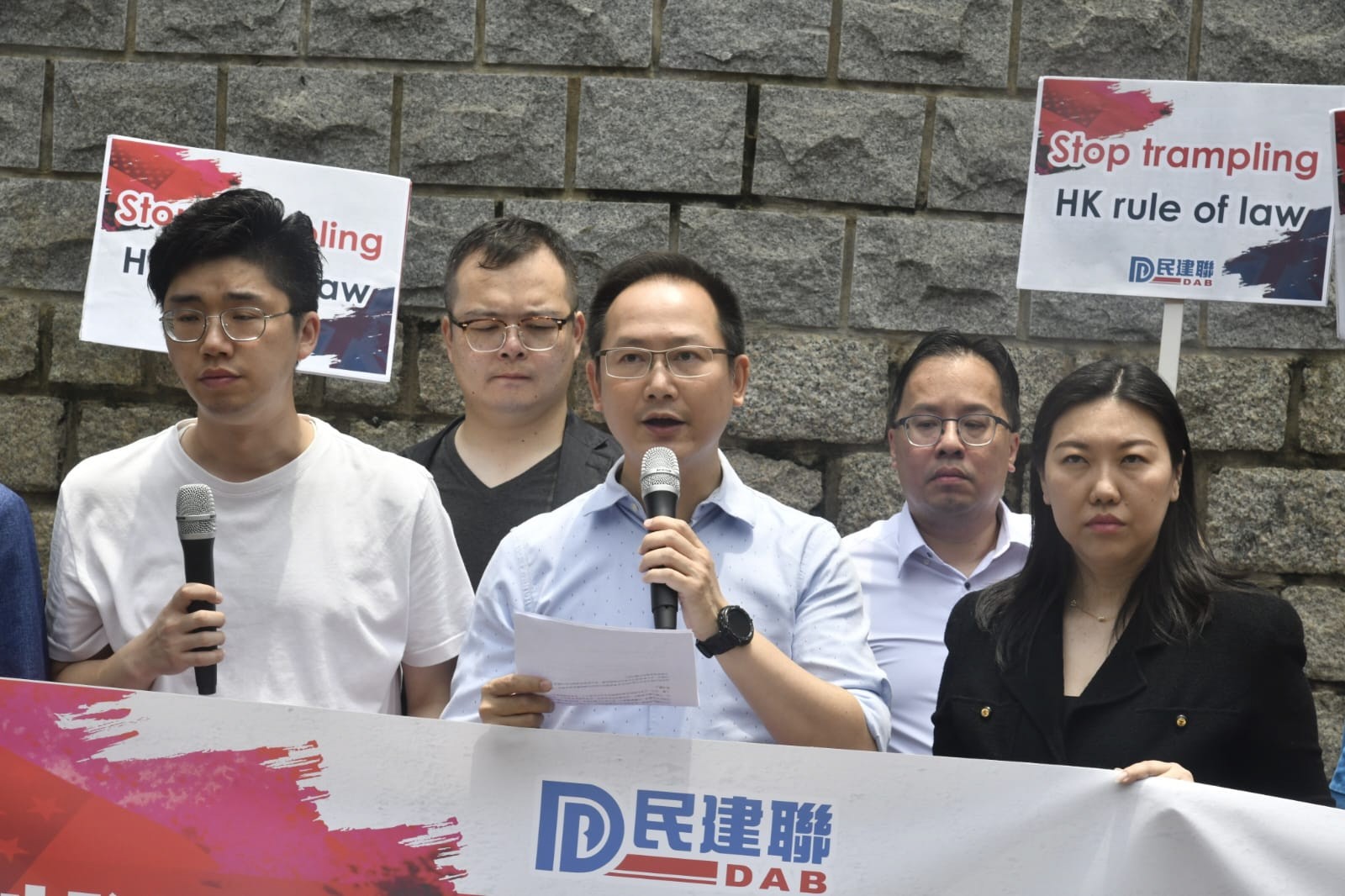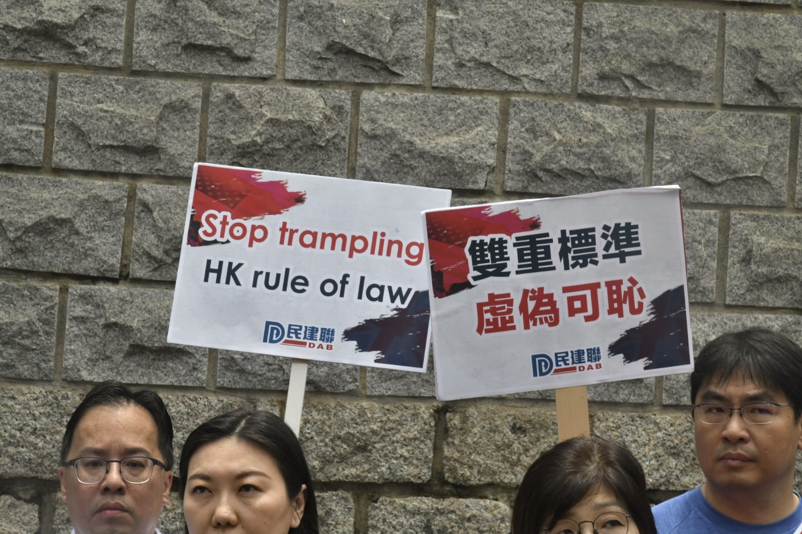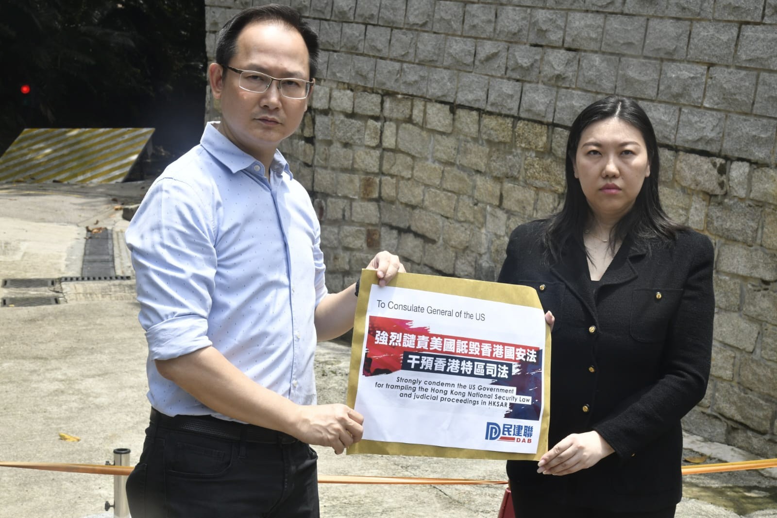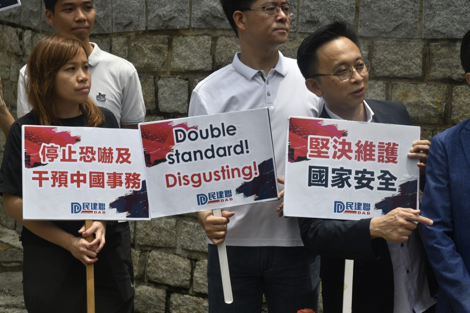 民建聯(lián)到美國(guó)駐港總領(lǐng)事館請(qǐng)願(yuàn),眾人高呼「民建聯(lián)強(qiáng)烈譴責(zé)美英政客詆毀香港國(guó)安法、干預(yù)香港特區(qū)司法,維護(hù)國(guó)安天經(jīng)地義,不容別國(guó)指手畫(huà)腳,美國(guó)雙重標(biāo)準(zhǔn)可恥。香港司法公正獨(dú)立,不容外國(guó)踐踏」等口號(hào)。