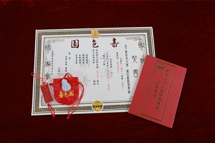 黃大仙師上契信物——刻有契子女姓名的仙師聖像葫蘆玉珮及契書。契書為上契者與神明的契約證明;玉珮乃上契者與其信仰的神明之憑證物件,玉珮正面雕刻仙師畫像,背面刻有「嗇色園」及上契子女的姓名。