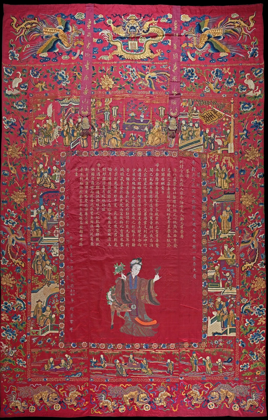 香港歷史博物館收藏的屏山鄧族祝壽賀幛,高4米多,上面飾有郭子儀祝壽及麻姑獻壽等寓意長壽的吉祥圖案。(政府新聞處)