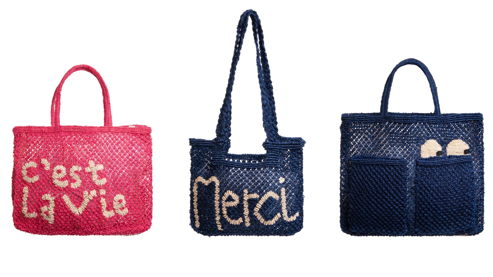 AMIE Sofie靛藍(lán)色直條紋手袋(HK$690)、NOW OR NEVER手袋(HK$890)、BONJOUR Stellina黃麻手袋配鮮粉紅或靛藍(lán)色文字(HK$690)