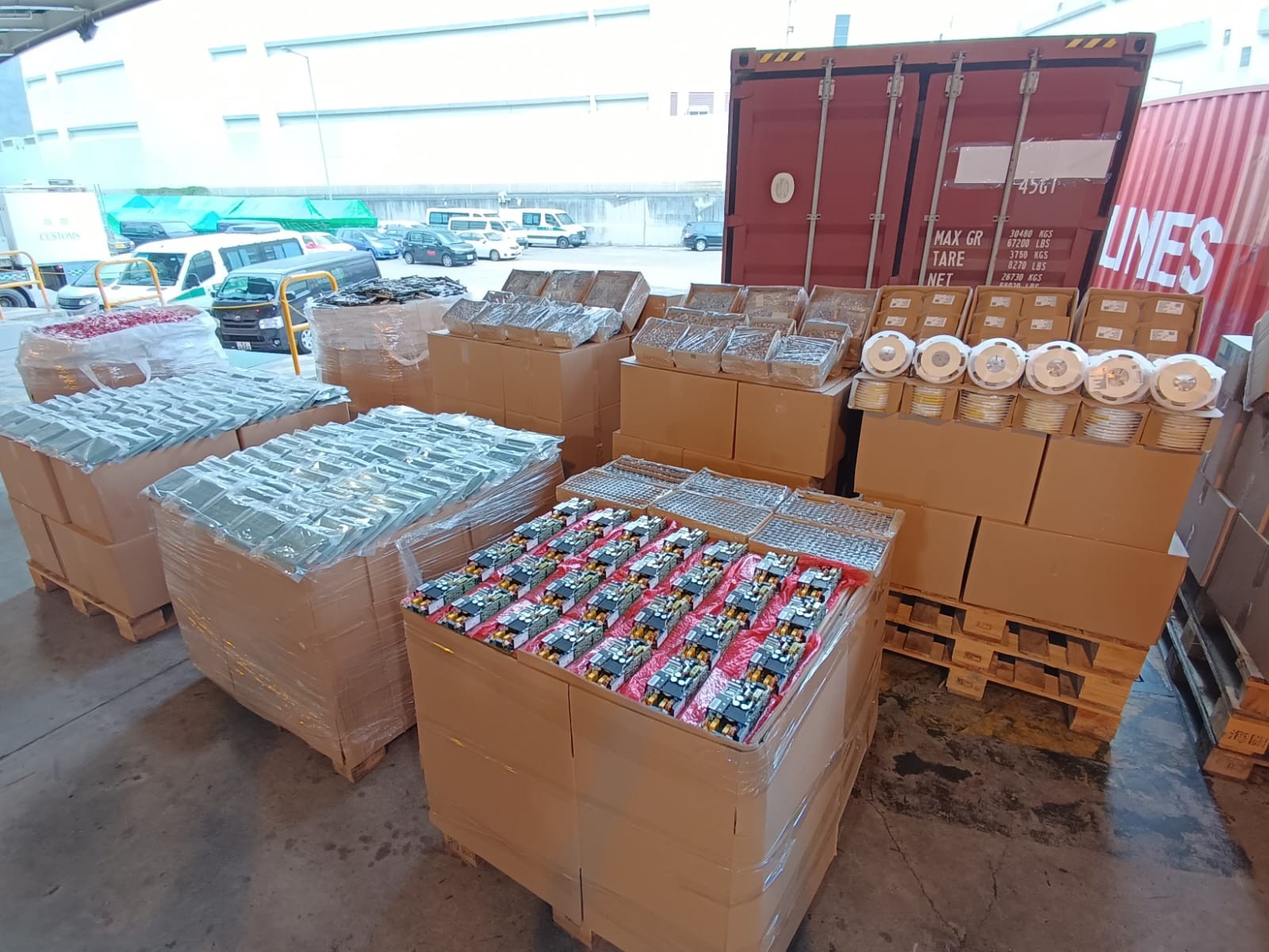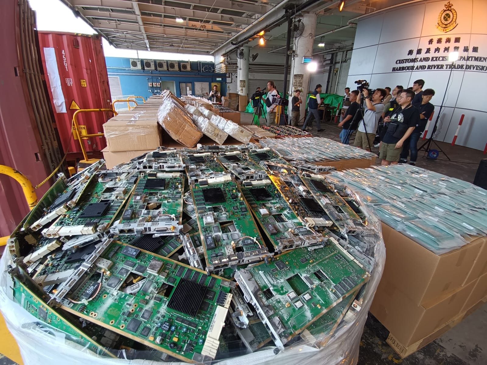 海關(guān)有組織罪案調(diào)查科特別調(diào)查第2組指揮官張文傑今日(7日)表示,4日透過情報分析及風(fēng)險管理,鎖定兩個可疑出口貨櫃,原定經(jīng)遠(yuǎn)洋船運往馬來西亞,分別報稱載有鋁材和銅合金。人員詳細(xì)檢查後在貨櫃中發(fā)現(xiàn)大批未列倉單的不同類型電子零件和產(chǎn)品,包括簇新集成電路、電容器和LED燈飾等,另外有二手顯示屏、底板和電子廢料,總值約8000萬元,案件仍在調(diào)查中,不排除稍後有人被捕。