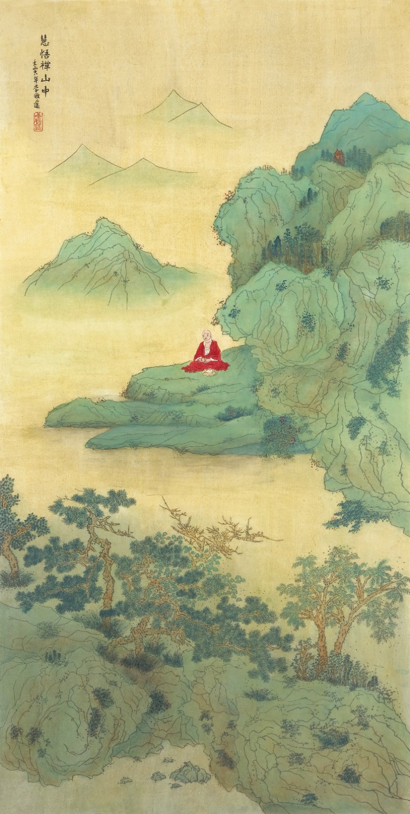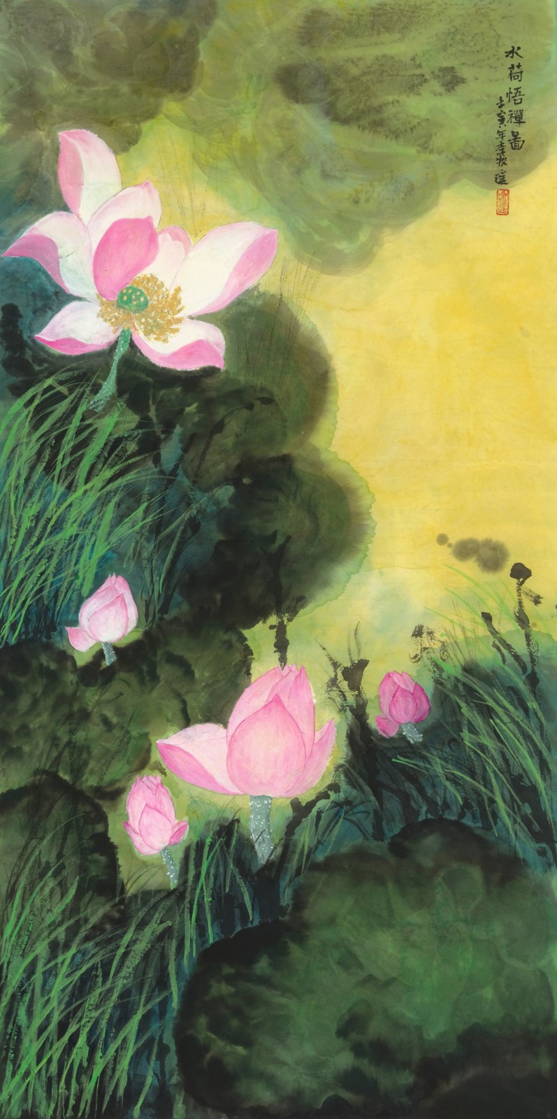 是次展覽展示的100幅國畫分為三個部分,第一部分是紅衣羅漢在綠水青山中禪修;第二部分畫家曾經(jīng)寫過24節(jié)氣詩歌,是次將24節(jié)氣圖用花卉去表現(xiàn),以繪畫花卉的方式創(chuàng)作;第三部分描繪荷花的禪修模樣,每幅荷花圖的名稱均帶有「禪」字。李牧遙介紹:「紅衣羅漢禪修系列用了傳統(tǒng)的工筆手法繪畫,同時加入了寫意體現(xiàn)情感主題。24節(jié)氣花卉和荷花系列運用工筆繪畫造型,卻使用油畫中印象派技法繪畫,多了些個人化和情感化的表達(dá)?!顾硎荆蛊吩趥鹘y(tǒng)繪畫的基礎(chǔ)上加入不少創(chuàng)新元素,包括其個人情感釋放。觀者不妨從李牧遙的工筆青綠山水畫作中,感受她內(nèi)心的禪意。 (記者:Janice)
