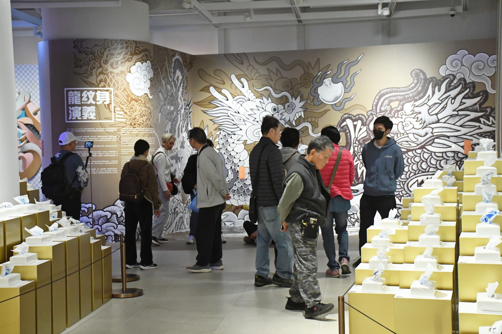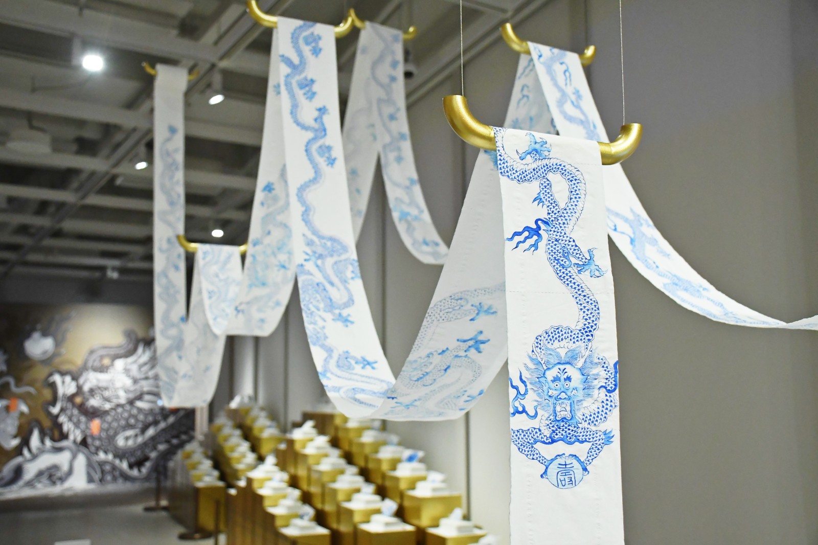 另一件展品是許開嬌的《百龍紙躍》,以工筆水墨繪畫元明清的五爪金龍,採用的藝術(shù)媒介是紙巾這種日常用品。朱天韻說,有不少觀眾查問紙巾品牌、創(chuàng)作背後的故事:「觀眾看到熟悉的品牌、與生活有關(guān)的展品時會感到好奇,從而引起思考。商場消費(fèi)者是展館的目標(biāo)觀眾,因觀眾層面廣闊,策展時會選擇人人看得懂的作品?!?/p>