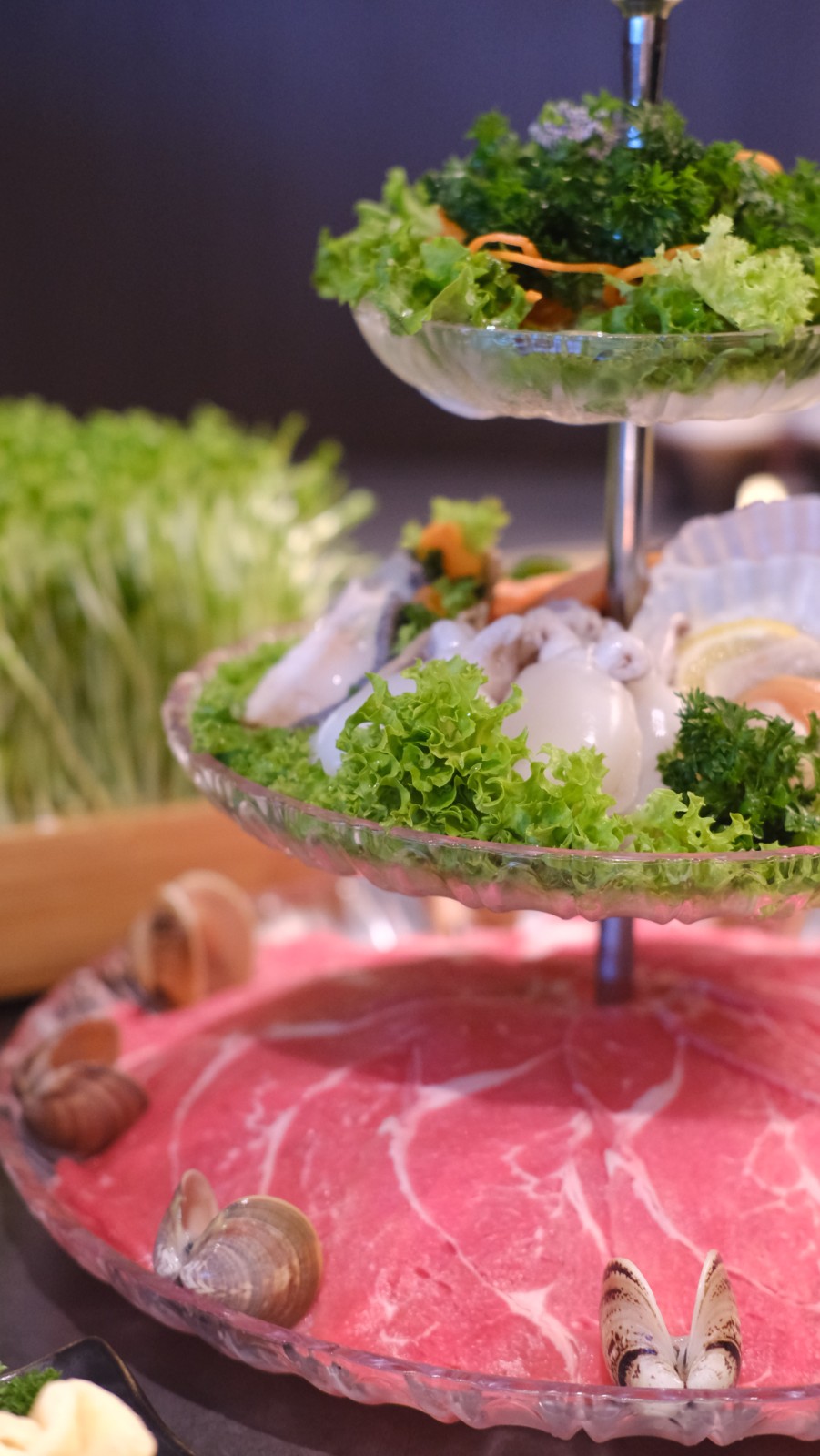 餐廳推出多款湯底選擇,「青花椒牛油果鍋」在青花椒湯頭中加入牛油果,牛油果肉的脂香浸入鍋中,鮮辣鹹香。另一款「臺(tái)式麻辣鍋」以雞骨及牛骨用小火燉6小時(shí),再輔以紅棗、枸杞等中草藥材熬製2小時(shí)而成。湯料內(nèi)附有可無(wú)限添加的鴨血和豆腐,層次豐富。愛(ài)美人士可選擇「紅顏花膠雞鍋」,採(cǎi)用花膠、低皮脂雞肉、野米、鮑魚(yú)、花菇等食材熬煮而成,湯底濃稠金黃。