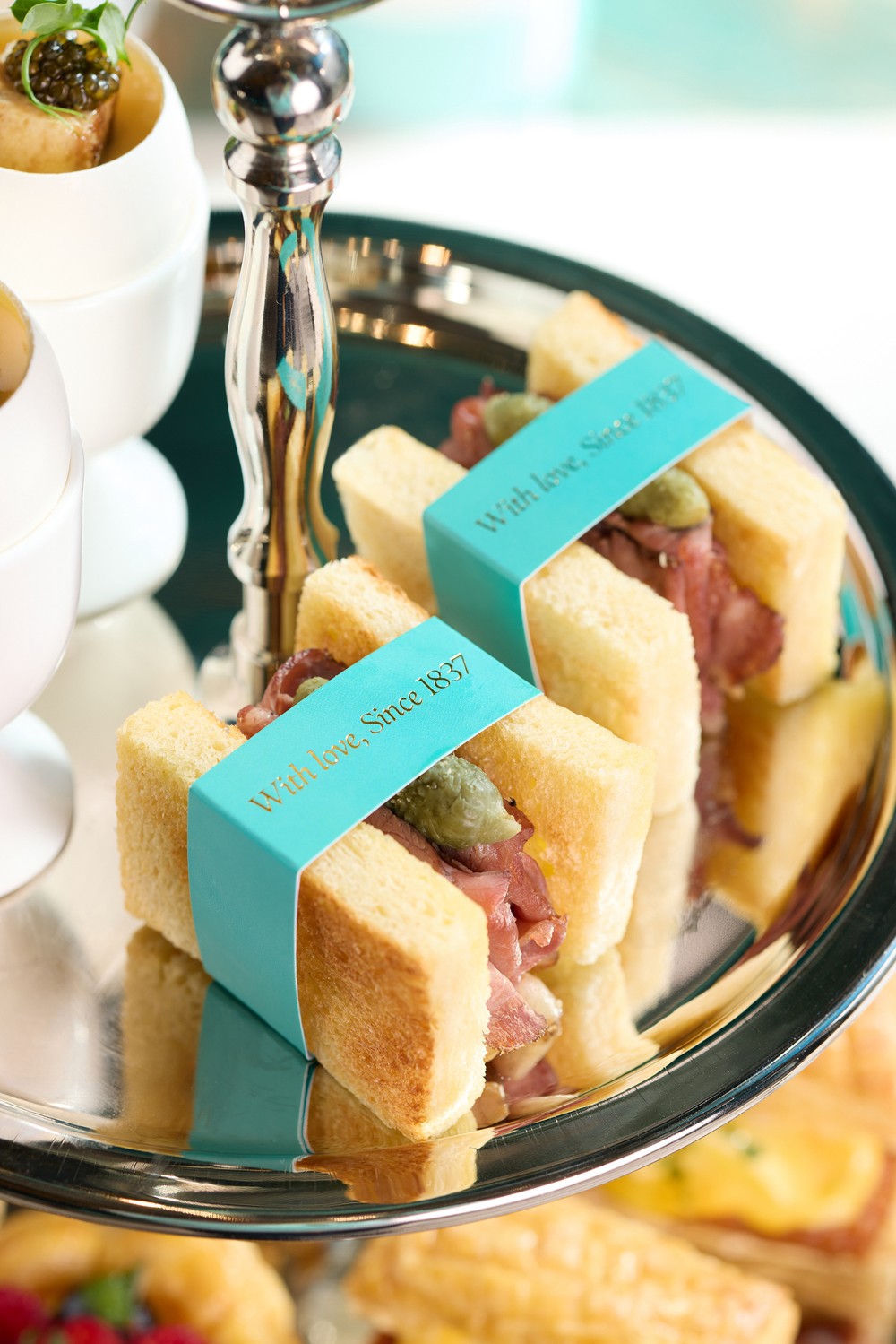 層架的上層復(fù)刻紐約第五大道的Blue Box Cafe 佳餚,雞蛋杯搭配魚子醬、鵝肝及櫻花蝦蒸蛋,味道層次豐富。迷你煙燻牛肉吐司是紐約經(jīng)典三文治口味之一,煙燻牛肉與黑松露蛋黃醬融合,口感豐富。下層的新餐肉拿破崙提供健康素食選擇,鬆脆酥皮配搭 Omnipork 新餐肉及蛋沙律,創(chuàng)意且美味。