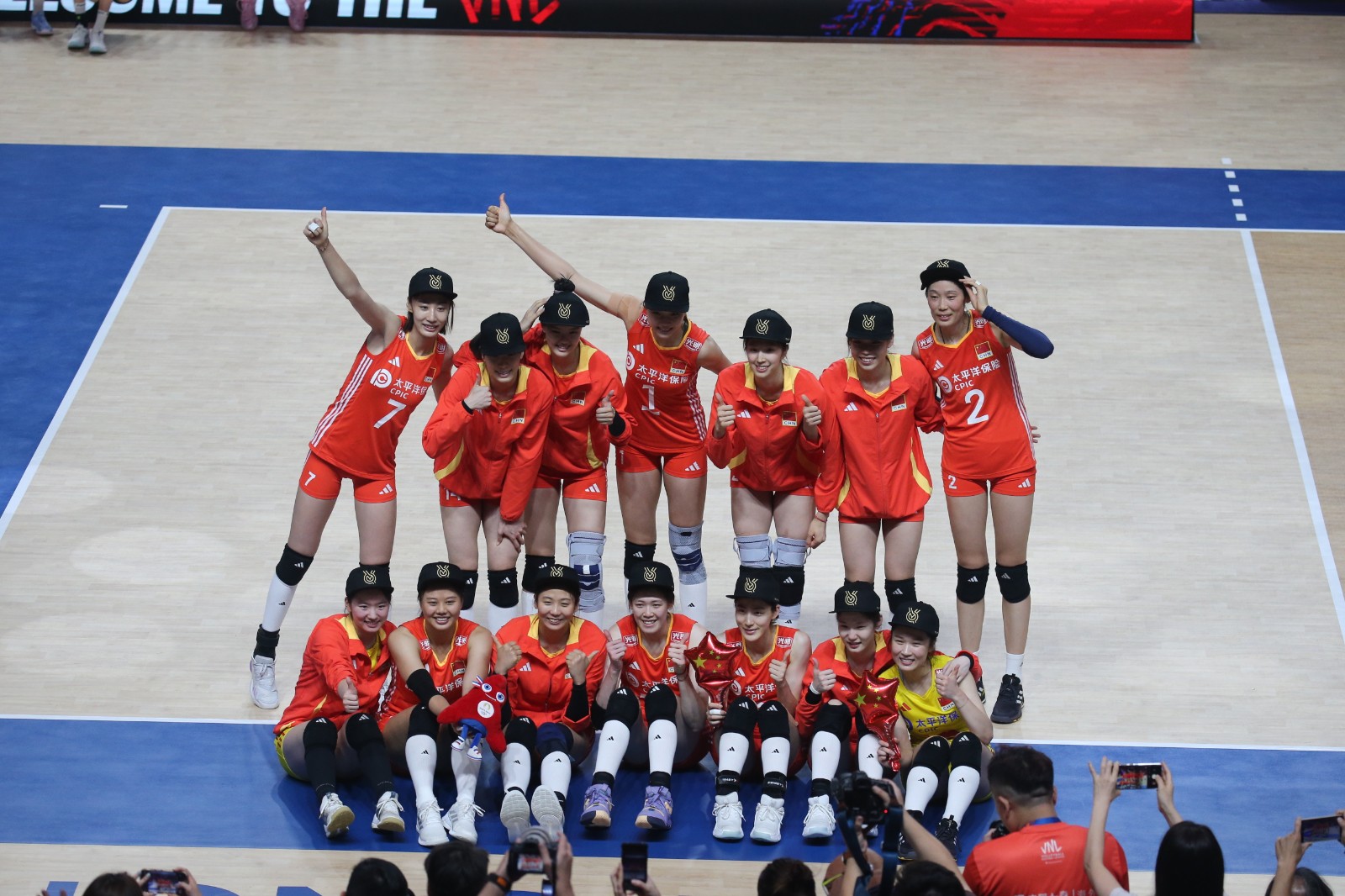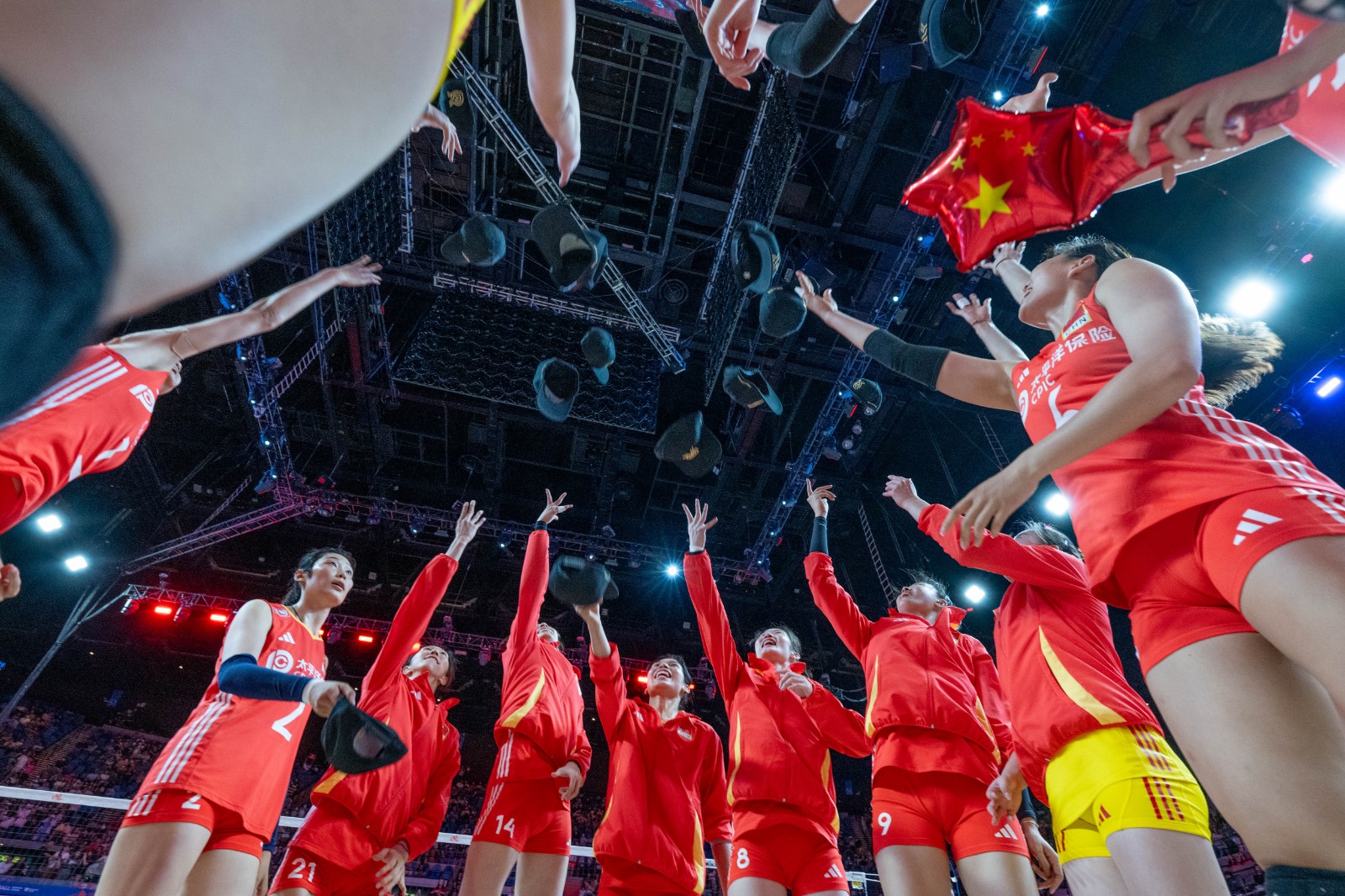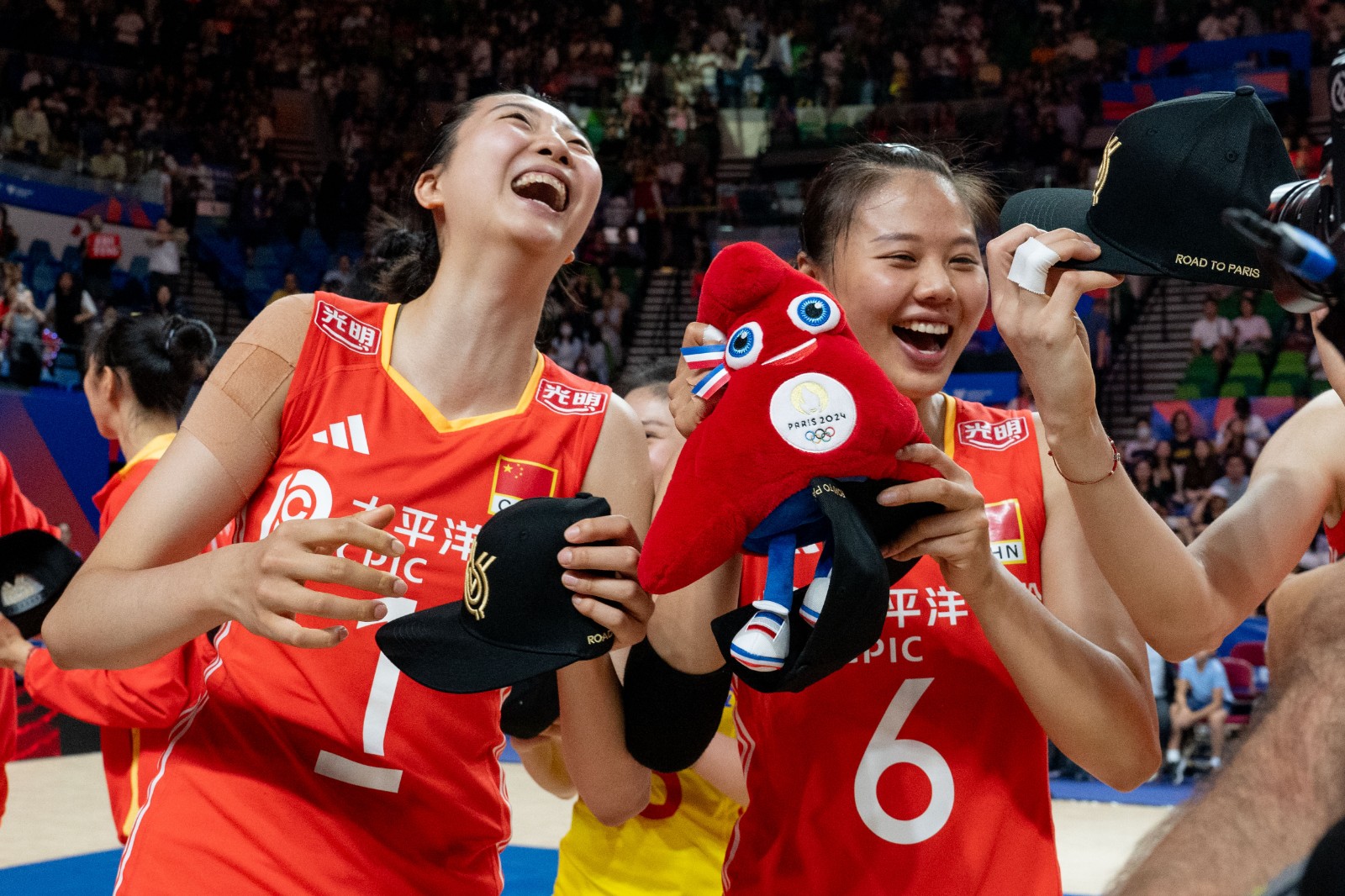 賽前中國女排已經(jīng)取得巴黎奧運入場券,賽後國際排聯(lián)為國家隊舉行慶祝儀式,向全體隊員送上印有「ROAD TO PARIS」(通往巴黎)字樣的帽子,一眾女排隊員戴上帽子,合影過後,隨即將帽子拋向空中慶祝,場面歡愉。