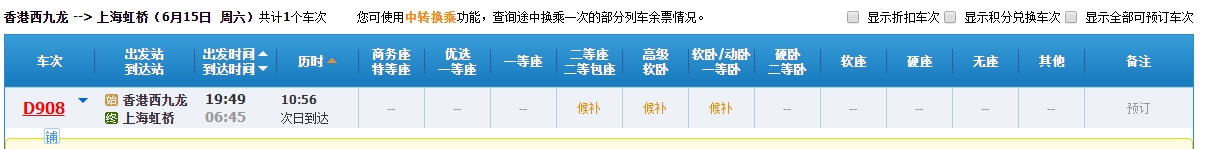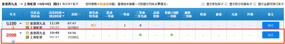 首班由西九龍站前往上海的D908次動臥列車,將於晚上7時49分開出,途徑深圳北、潮汕、廈門北、杭州東,明早6時45分抵達上海虹橋站,全程歷時10小時56分。同樣,6月15日的車票已售完,6月16日的車票還有富餘。