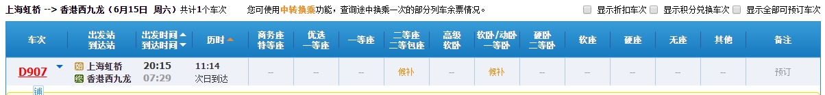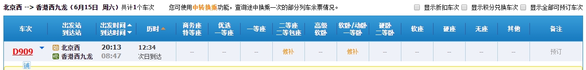 首班由西九龍站前往北京西站的D910次動臥列車,將於今日傍晚6時24分開出,途徑深圳北、東莞南、廣州、長沙南和石家莊5個站點,明日早晨6時53分抵達北京西站,全程歷時12小時29分。12306網(wǎng)站顯示,目前,6月15日的車票已售完;6月16日的車票也所剩無幾,僅剩7張二等座車票。