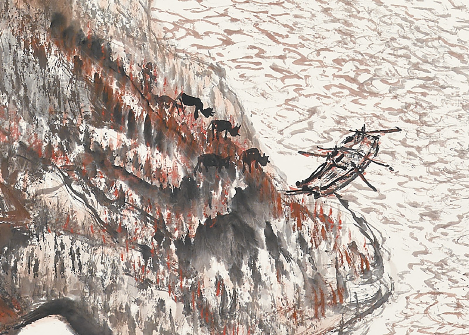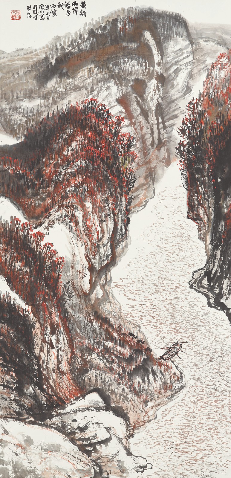 ?。ㄎ模菏挿溢鳎?/strong>長安畫派代表性畫家趙振川的山水畫具有鮮明的地方特色,題材新穎而又能與傳統(tǒng)筆墨相結(jié)合,充滿古韻新聲。其《黃河兩岸渡春秋》布局氣勢磅礴,用筆十分率真生動,用朱筆點染出一派「萬山紅遍,層林盡染」(毛澤東《沁園春·長沙》)的壯麗景象。山峰的繪製用筆肆意而水氣淋漓,生動自然地表現(xiàn)出巍峨壯闊的感覺。趙振川作畫喜用枯筆或淡墨向同一方向作皴,破開線條與輪廓,使畫面富有節(jié)奏感,充滿筆墨的韻律。河面的波紋採用捲曲的線條揮寫而成,黃河的浩蕩聲勢滾滾而來,令人如臨其境。