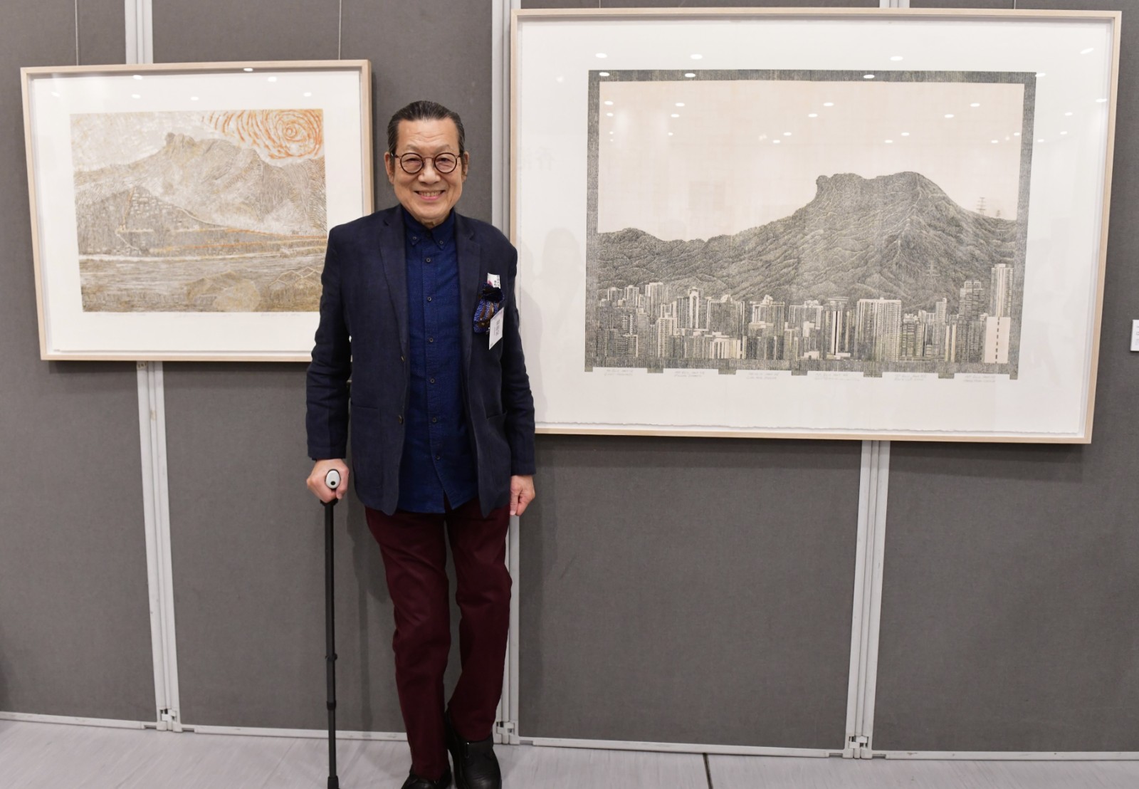 畫(huà)家呂豐雅及其作品《城內(nèi)城外1840s》(左)、《不朽的獅子山》(右)。
