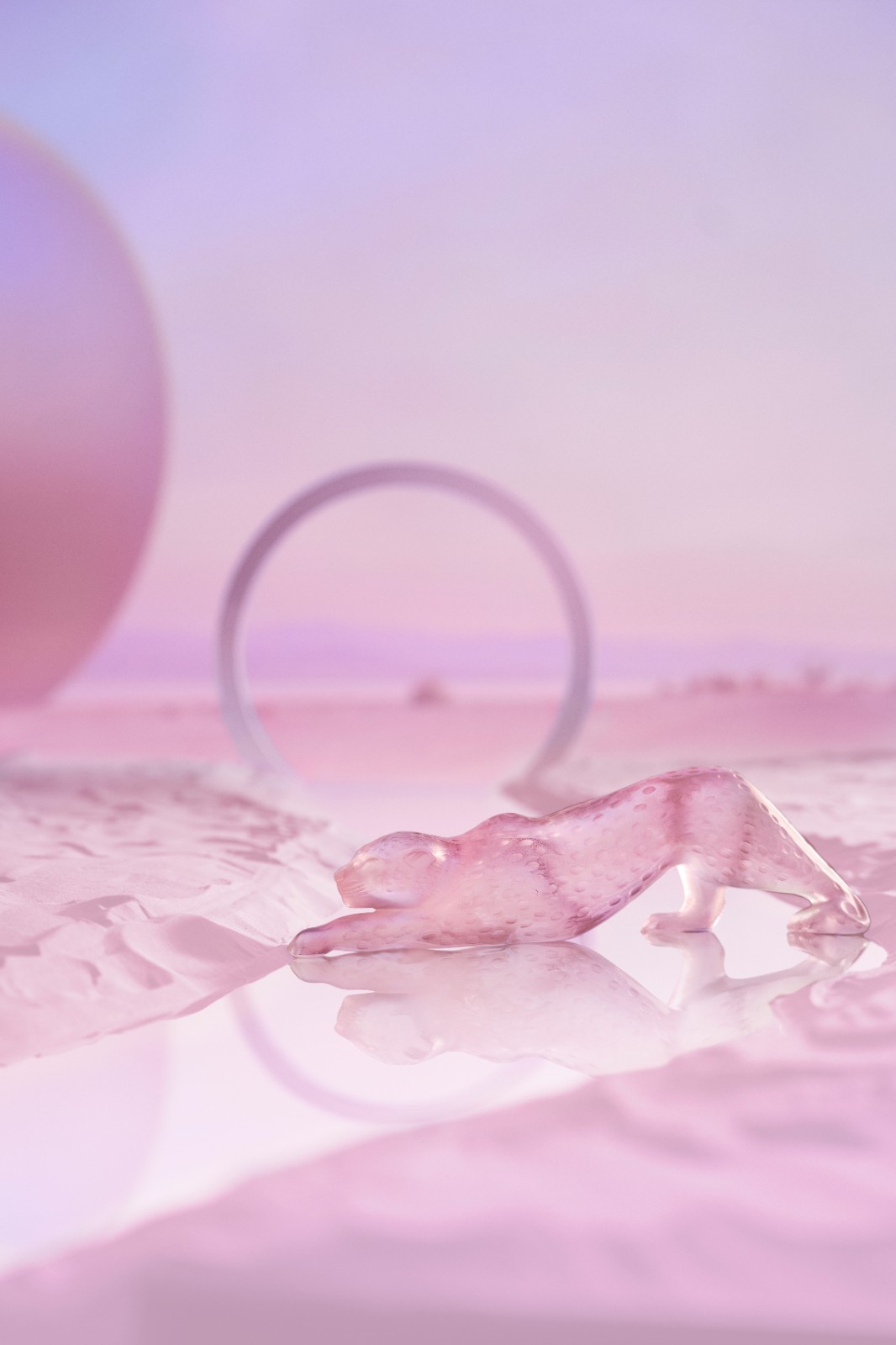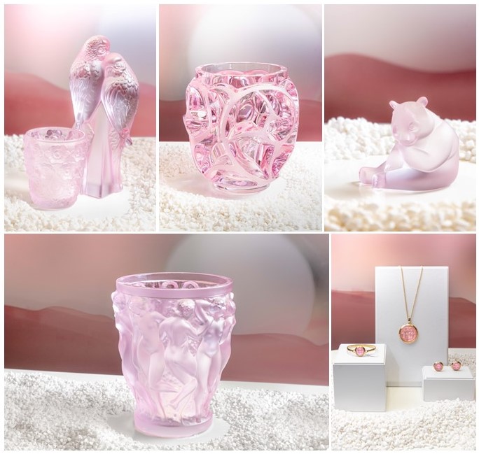 系列標(biāo)誌性作品被罩上粉紅色面紗,將遠(yuǎn)古時(shí)代的遺跡和立體投影結(jié)合,展示了酒神女祭司、美洲豹和迷人的鳥兒等元素。包括品牌1927年由 René Lalique 設(shè)計(jì)的 Bacchantes(豐收十美女)花瓶、1930年的 Moineau Sparrow(小麻雀)雕塑,以及1933年的 Mossi(圓滿寶瓶)花瓶,這些作品在新系列中以粉紅色調(diào)重新演繹。