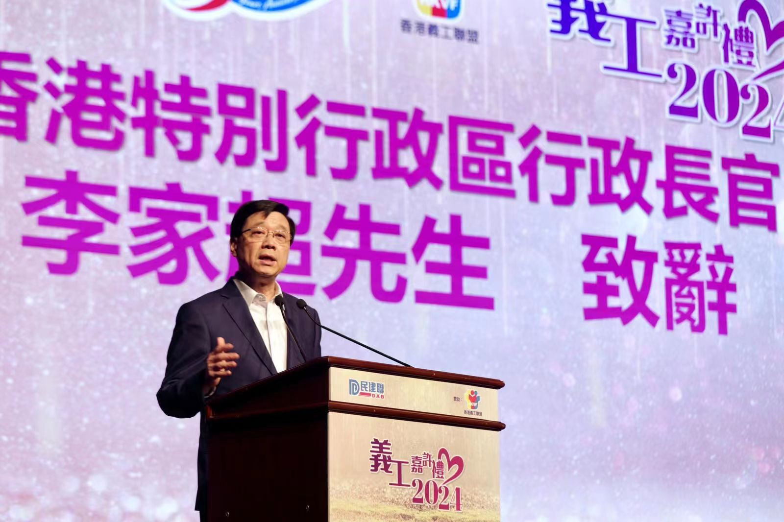 連續(xù)第二年出席民建聯(lián)義工嘉許禮的行政長官李家超致詞時表示,他相信「愛國愛港」力量是推動民建聯(lián)義工為社會服務(wù)的最大後盾。