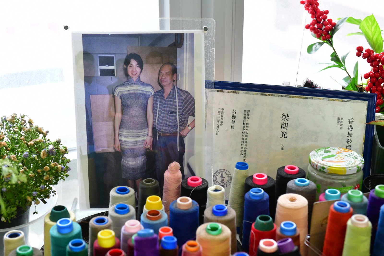 梁朗光工作室內(nèi)掛著《花樣年華》劇照及他與張曼玉的合照。梁師傅透露他與張曼玉一直保持聯(lián)絡。(崔俊良攝)
