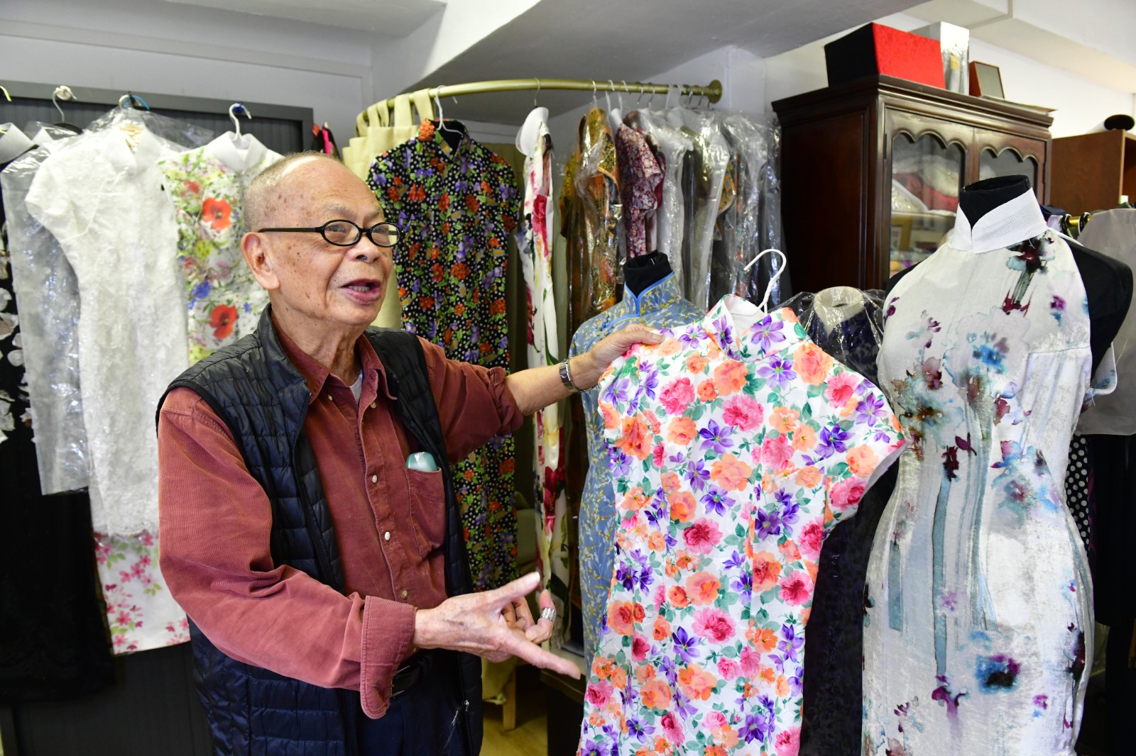 梁朗光工作室內(nèi)的客訂旗袍。(崔俊良攝)