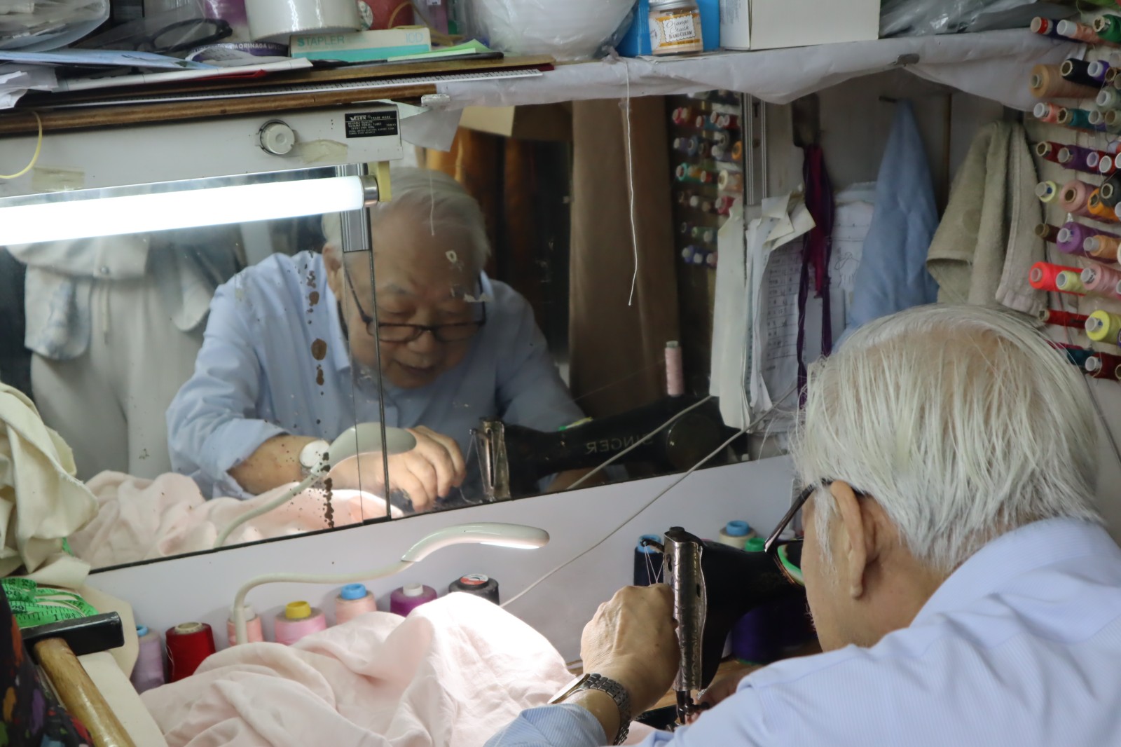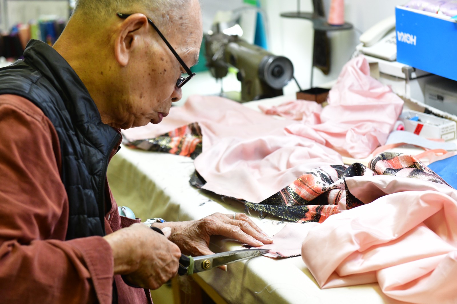 殷家萬從事旗袍裁縫工作超過半世紀,如今年過80﹐依然每日埋首車衣間工作。