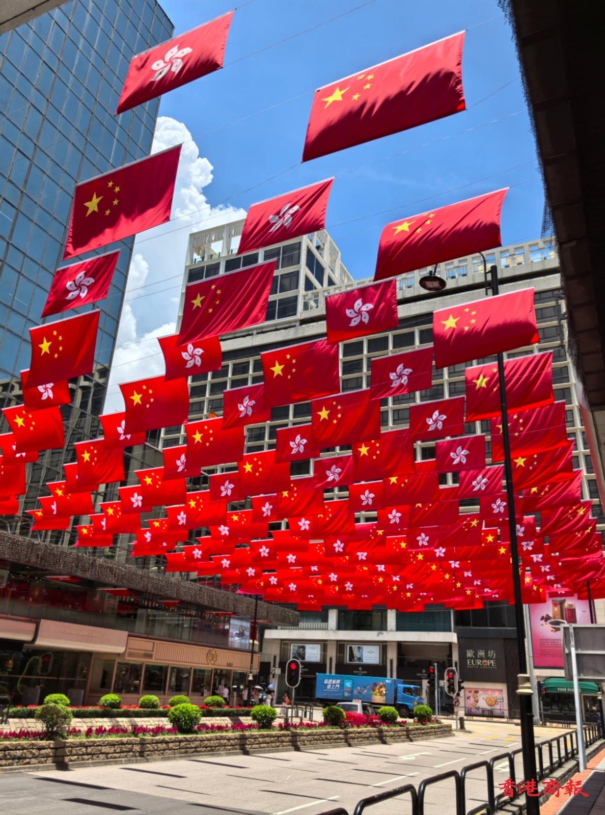 香港街頭的國(guó)旗、區(qū)旗飄揚(yáng)。記者 李承泰攝