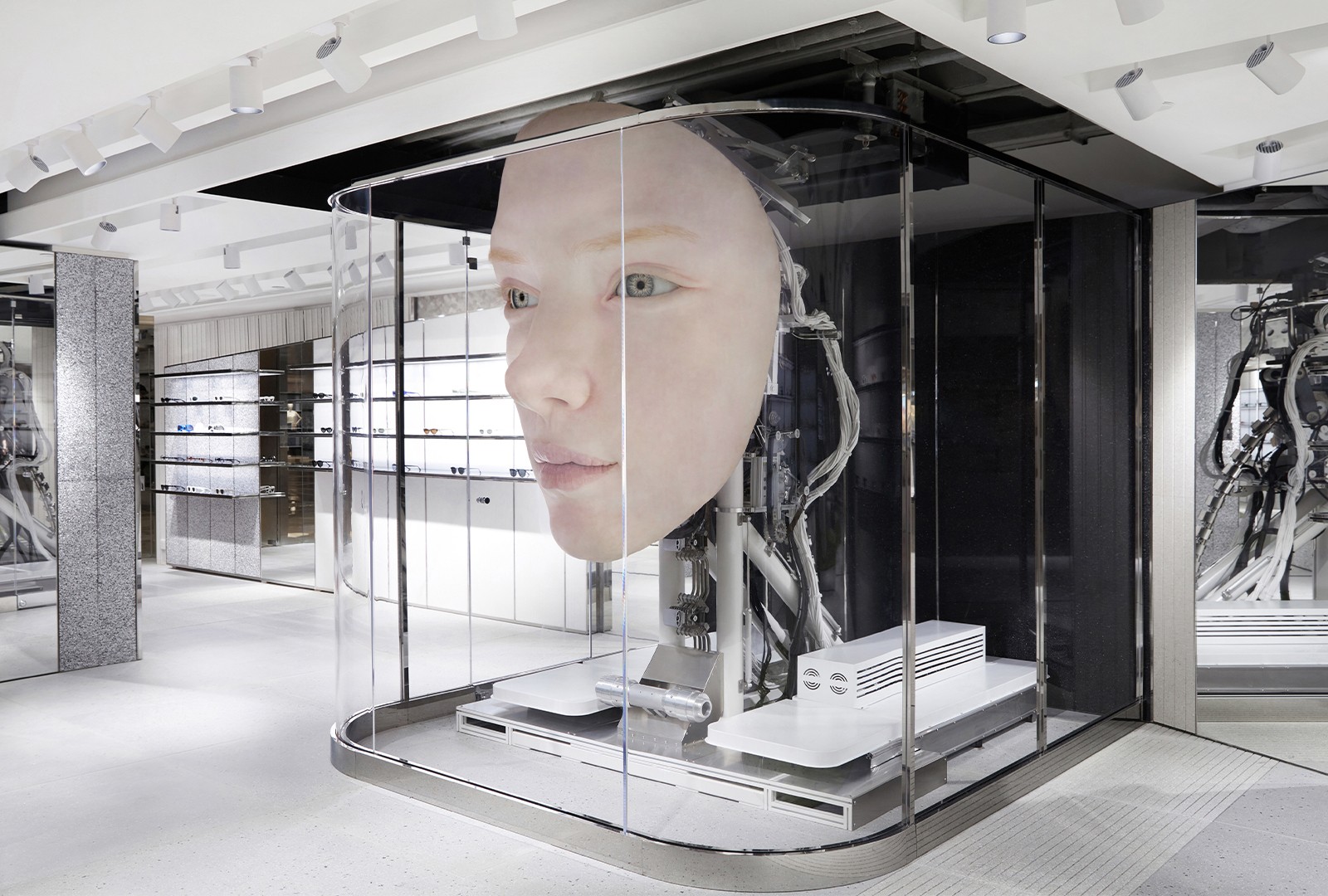 新店除了呈現(xiàn)經(jīng)典款眼鏡外,還有與設(shè)計(jì)前衛(wèi)怪誕品牌Maison Margiela的聯(lián)乘系列、光學(xué)系列「GENTLE HIGH SCHOOL」、JENTLE SALON系列。門店中央佇立了巨型動(dòng)態(tài)裝置「THE GIANT」,由品牌的機(jī)器人實(shí)驗(yàn)室用一年時(shí)間創(chuàng)製,巨型的機(jī)器人臉部神情十分像真,營造出微妙的先鋒感和科技感,啟發(fā)觀看者對(duì)於人類與機(jī)器人未來關(guān)係的深度思考。