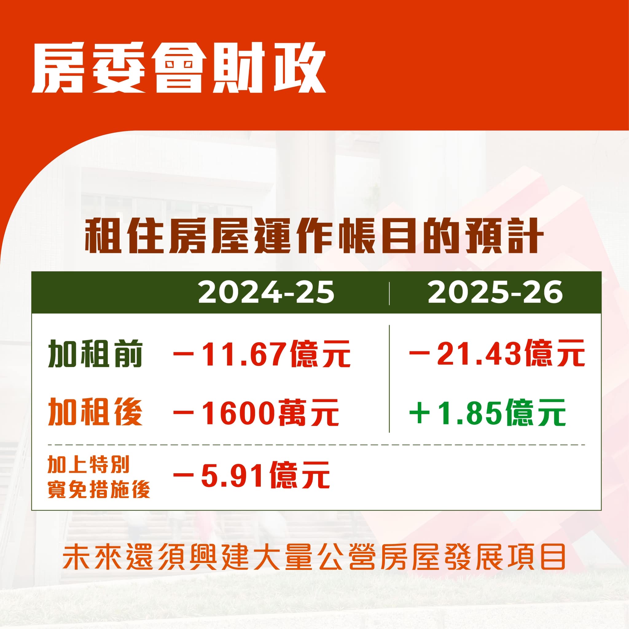 文件指出,上調(diào)租金將帶來(lái)每年約23億元的額外收入,扣除其他公屋租戶在首3個(gè)月豁免租金加幅安排,涉及款項(xiàng)5.75億元,預(yù)計(jì)2024/2025年度將會(huì)由原來(lái)預(yù)計(jì)約11.67億元赤字,收窄至5.91億元赤字。