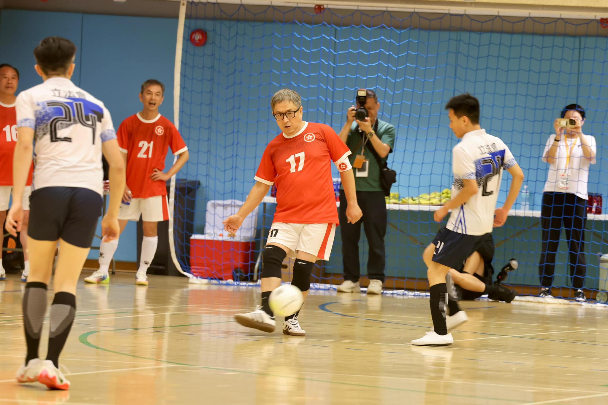 政府官員和立法會(huì)議員今日(20日)下午在香港理工大學(xué)體育中心舉行5人足球友誼賽,行政長(zhǎng)官李家超與立法會(huì)主席梁君彥一同主持開(kāi)球禮,並為出戰(zhàn)巴黎奧運(yùn)會(huì)的中國(guó)香港代表團(tuán)打氣。
