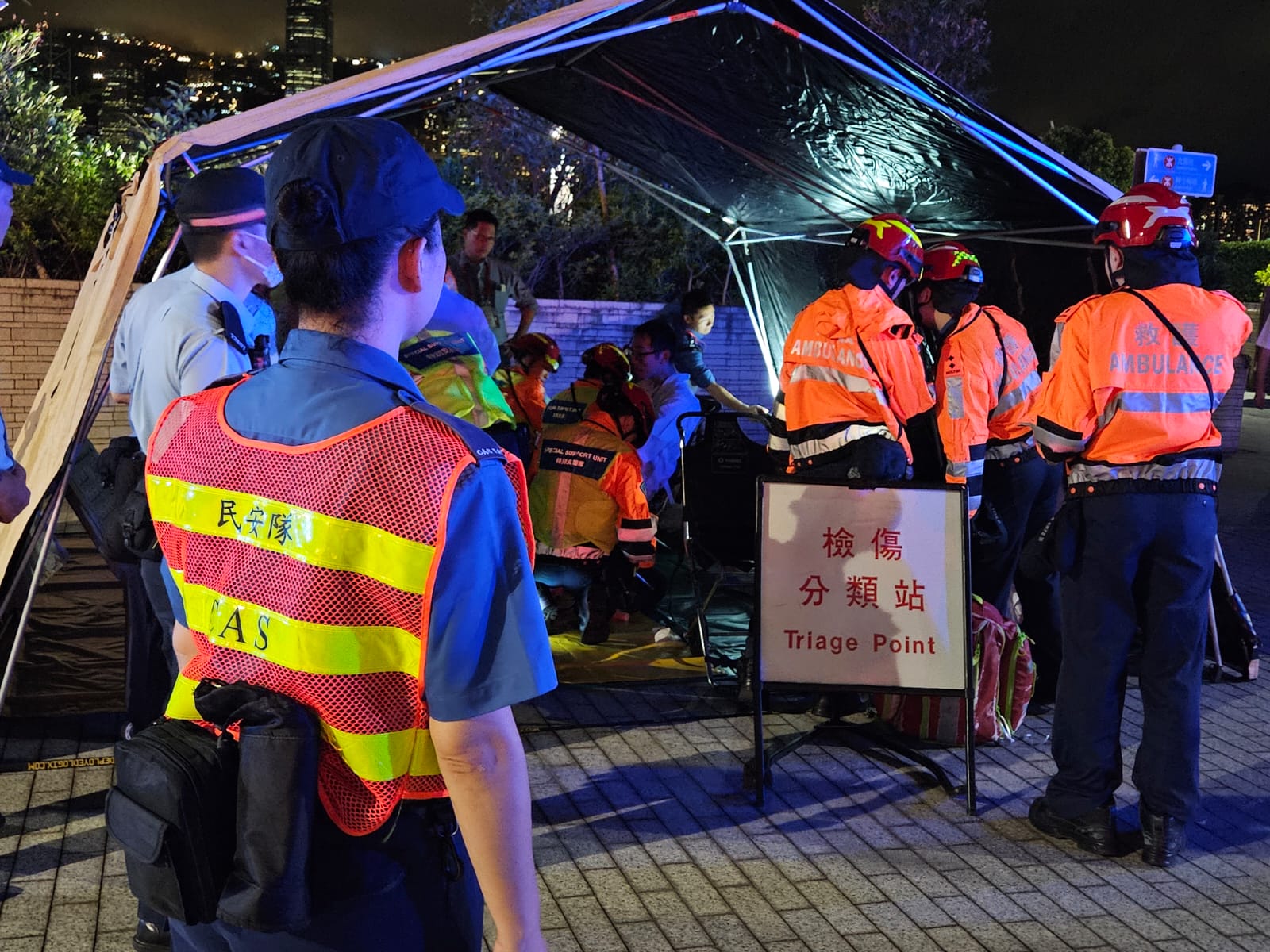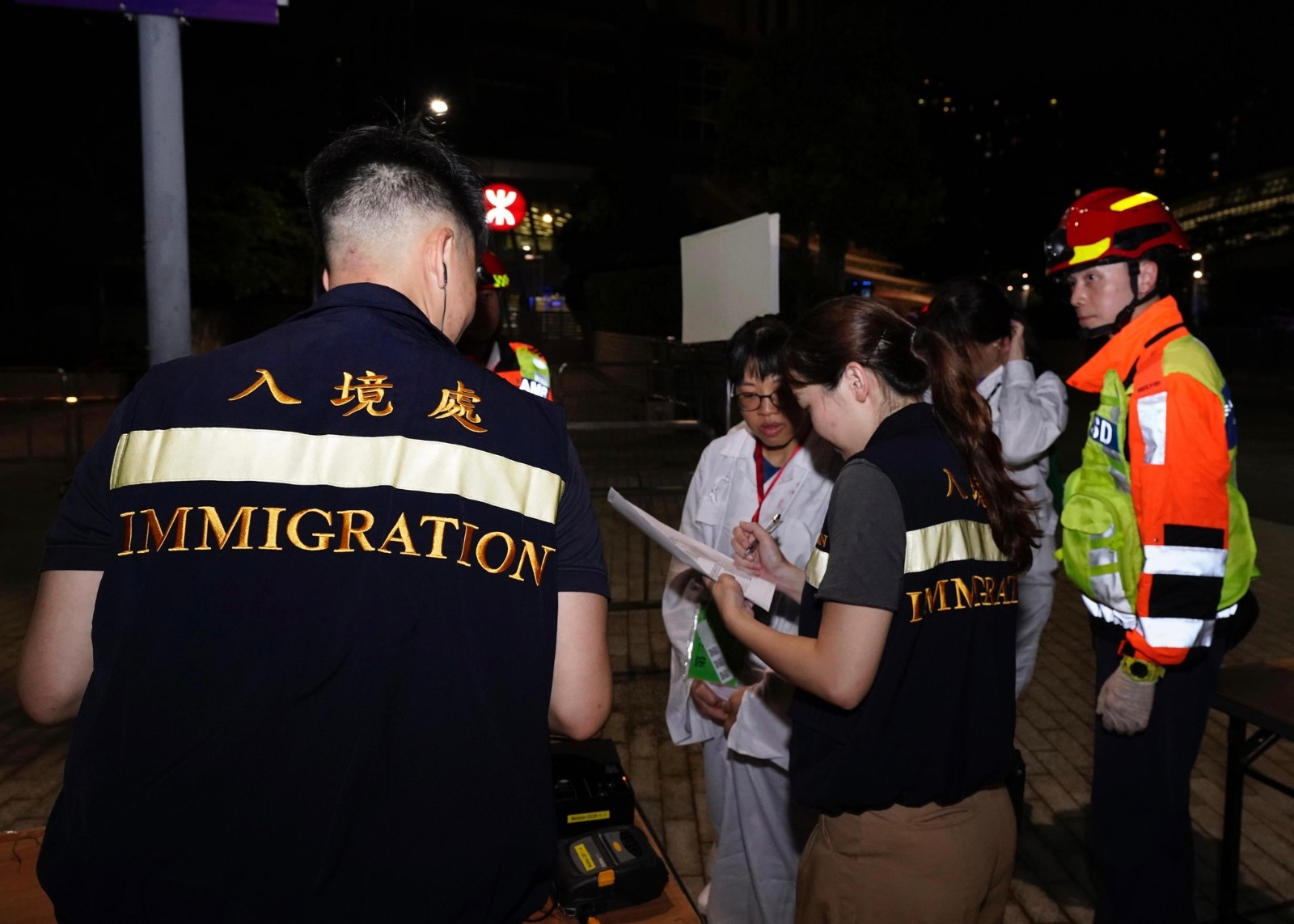 消防處接報後立即派員到場進行救援及疏散工作,並設立「危害物質事故」洗消設施,救護人員亦為傷者分流及治理。所有傷者及乘客在警務處及民安隊人員嘅協(xié)助下被帶到指定區(qū)域,並交由入境處及海關人員進行出入境及清關手續(xù)。今次演習將進一步加強跨境跨部門處理大型事故嘅協(xié)調能力同埋行動效率。(消防處社交媒體圖片)
